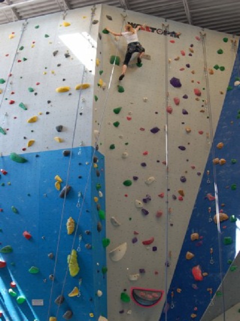After getting into our climbing gear and shoes provided by the gym, Brad, the assistant manager, took time out of his busy schedule to guide us, belay us, and frankly, make sure we didn’t kill ourselves. He explained to us how the multiple colored holds on each wall served a purpose other than just a pretty design. Each color marked a route up the 40 foot walls, ranked according to difficulty level. The 5.6 and 5.7, and even the 5.8, didn’t offer too much of a challenge. McKell would scoot up the walls like a squirrel up a tree, and not to be outdone, I would follow, although not quite so fast or elegant, but still making it to the top. So McKell bumped it up a notch to 5.9. That was my limit, but McKell did it well. Ah, youth.