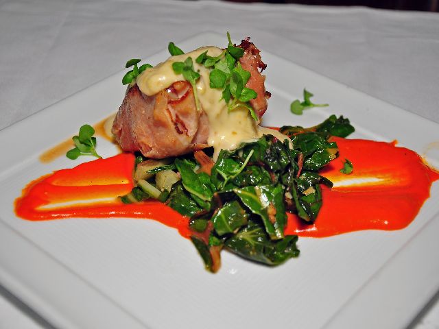 A good chunk of Columbia River white sturgeon is wrapped in Fra’Mani ham and topped with green garlic soubise on a bed of lacinato kale in piquillo pepper sauce.
