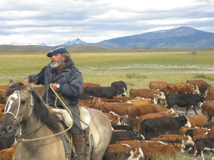Our Hostelaria included breakfast the next morning and it was like being in someone’s home and we could order eggs or eat cold array. Several backpackers were fixing their own in the open little kitchen. We had all slept well and were eager for our 10 hour bus tour of Torres de Paine National Park of Chile. The weather started misty but grew brighter as we rode through gorgeous lake and mountain scenery. We passed a cattle round-up with huasos on horseback and dogs herding the vacas off the road. At one point we stopped to take pictures of the large herd of wild guanacos, the native llamas which are brown and white.