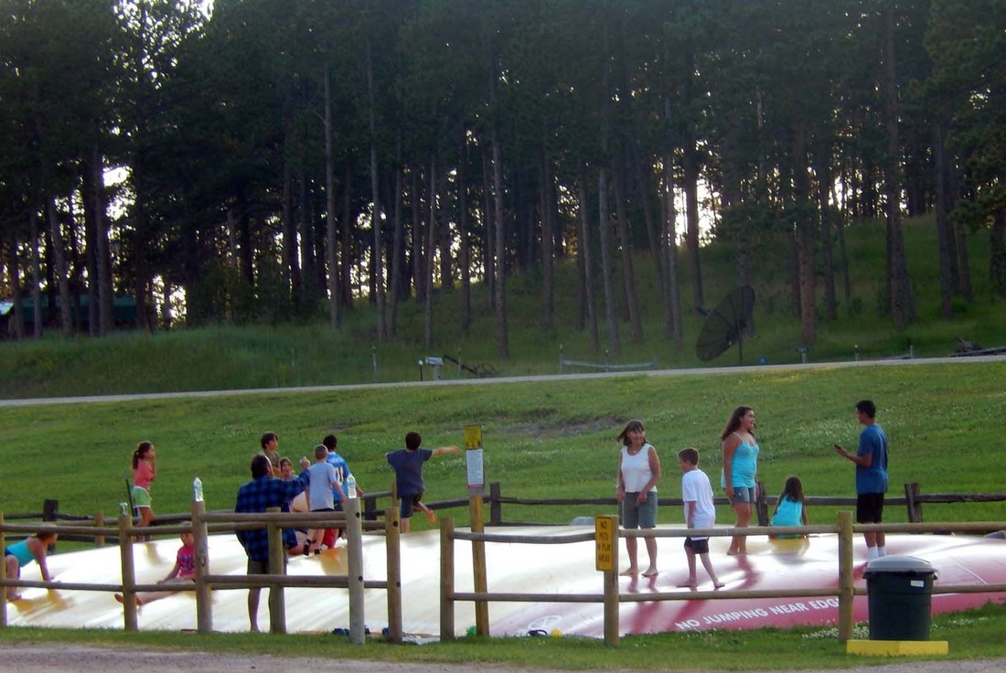In the cool, welcoming Black Hills of South Dakota you’ll find this wonderful Custer/Mt.Rushmore KOA Kampground with good gravel roads, wide, clean sites beneath ponderosa pines for any size rig, which dot this cool land. Even in mid-July when mid-day heat rises to around 90 degrees, the nights are delightful around 60 degrees. You’ll find many of the adorable and comfortable KOA Cabins, which are so popular, and pristine, well-groomed tent sites. Of course the camping store can supply almost any need you have, and coffee is hot and fresh all day. The swimming pool is cool and inviting in the hot hours of the day, but the wonderful giant jumping pillow, for a small daily fee, is the most popular. There are always children laughing and smiling in delight as they enjoy this great exercise, making adults want to join them. The rules for safety are good. If you are not into cooking, the friendly KOA hosts will make you a great chuck wagon breakfast.