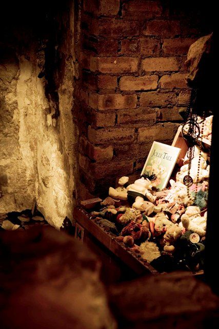 Key chains, jewelry, dolls, stuffed animals line the walls as a shrine to the sad little child who has long since passed away. ”What a sad story,” laments 10-year-old Harriet Peterson, visiting from London. She slowly adds the small stuffed teddy bear she is hugging to the other offerings.