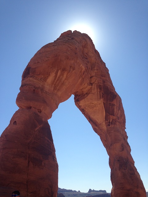 From there, freeing from the valley floor below, truly we had no idea the distance or grade in comparison to all else we had previously hiked. Now, I like to think of myself as “fat-letic”. I played sports for 35+ of my 45 years of life and coached for still another several years. While I’ve not fully maintained that status, we’d just returned from a week of walking theme parks in Orlando and we felt up to the task. That said, we were ill prepared for this hike. The grade was steep for most of the way. The sun was hot. Shade was scarce. Water was little relief. Stops were few and far between. Before finishing your hike to the arch, we’d recommend that the “pinnacle” of stops where you can be shielded from the heat would be the shaded rock atop the grade of the hike (just before again picking up the path that is only 500 yards or so from Delicate Arch itself). We stopped on the slab of rock in the shade there and laid every inch of exposed flesh on that shaded rock. Within minutes our core temperatures had gone down and we were back to enjoying ourselves instead of cursing the heat.