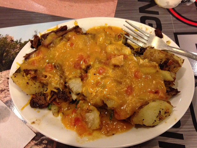 The night gave way to hunger. As always, we wanted to eat local. Where better than the Moab Diner www.moabdiner.com to cap off our day? I was hooked at the teaser that’s scrawled without the diner’s walls that touts the “The Best Green Chili in Utah”. That screamed to be proven or disproved. And, right they were! The Green Chili Smothered Sweetwater Potatoes with Skirt Steak added was out of this world!