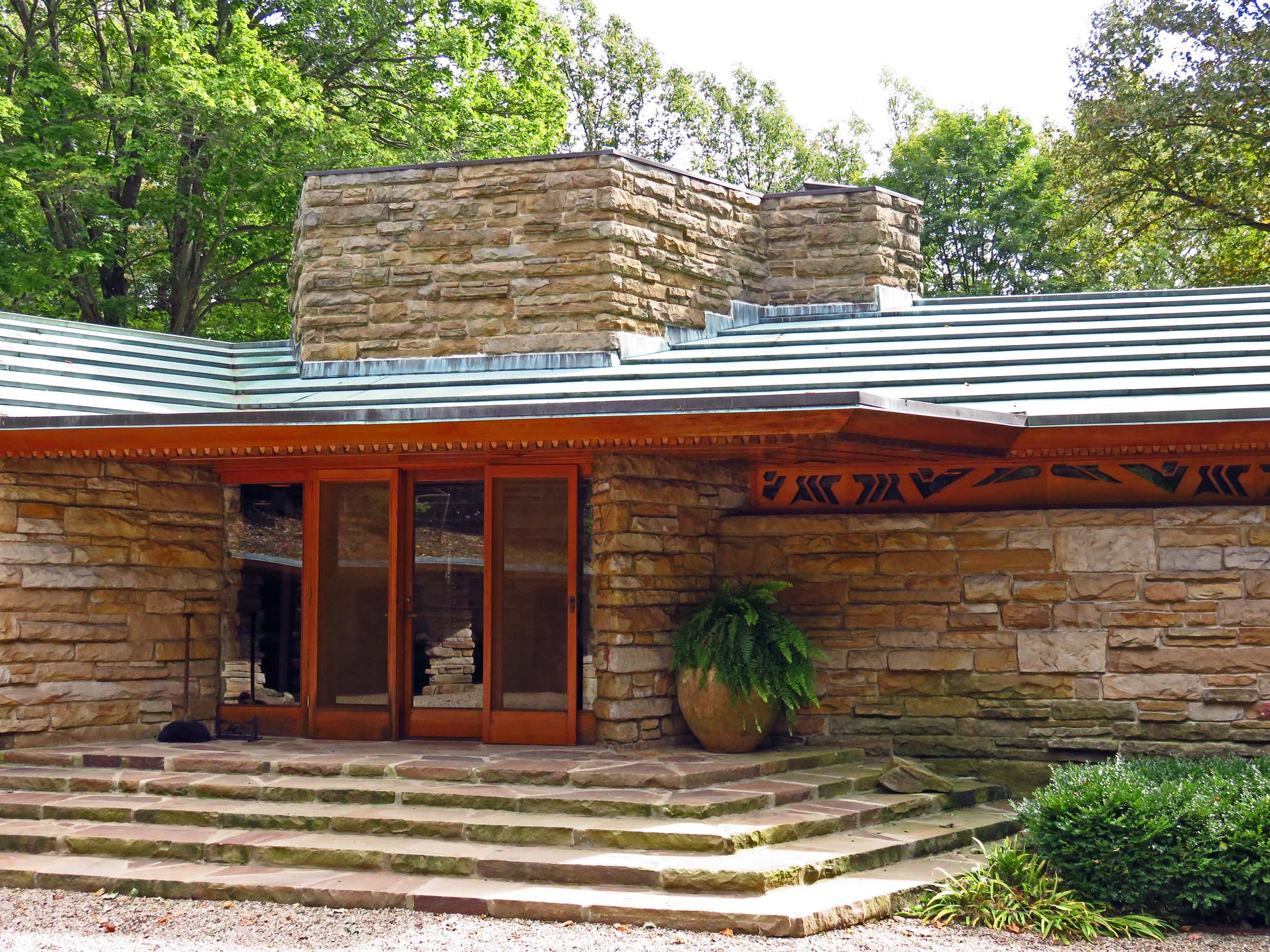 Kentuck Knob, the 1954 house of I. N. Hagan that was supposed to be built on top of a hill, was cut into the hill instead – in accordance with Write’s principles of organic architecture. The house is covered with a green patinated copper roof, and its bedroom windows are on the ground level to better observe the life of moles and gofers populating the hill. The house was fully designed by Write, but built by his apprentices. When the happy owners repeatedly invited the aged yet constantly busy with new projects famous architect to come and look at his own creation, he replied, “I don’t have to come see the house. I envisioned long ago what you’re observing now.”