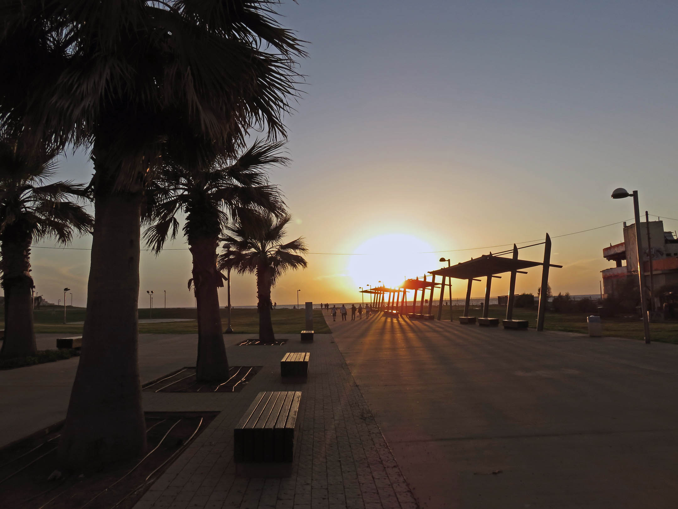 In one of the little squares nearby there’s a Ran Morin’s sculpture “The Hanging Orange Tree” – with a live tree hovering above ground. A symbol for Jewish people uprooted from the Biblical land, the tree continues to grow, blossom, and bring fruit all the time longing for its native soil. This place is often visited by school groups and educational tours… From Jaffa, a view of Tel Aviv at night reveals a treasure box of lights along the tide line of a glistening sea.