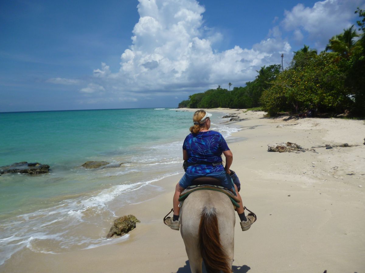 Our ride was capped off with a glorious lope on the beach. Tantalizing turquoise waters lifting foamy waves landed on the white sand shore. The cooling spray was a welcome respite from the tropical sun overhead. Back in the cool of the forest Jill shared her limitless knowledge of plants and local lore that included passing a shack where slaves lived in quiet desperation for hundreds of years until their revolt and emancipation in 1848.