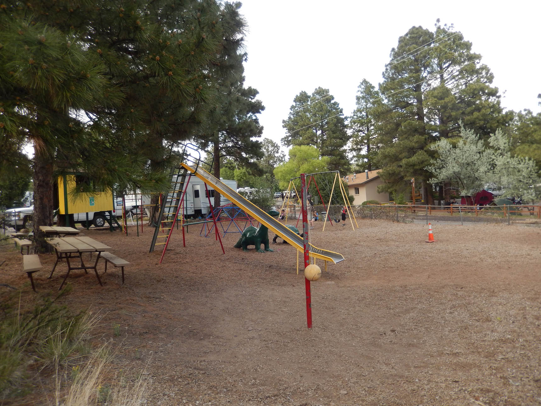 The very large playground is the site of many squeals of fun and laughter. Kids revel in outdoor play when camping, often quite different than what they do at home. Flagstaff KOA is adjacent to Coconino National Forest, so you can go through the little gate to walk on the trails there or hike up the mountain. The high mountains behind the campground were still snow-capped in May and reached far above us at this 7,000 feet high KOA!