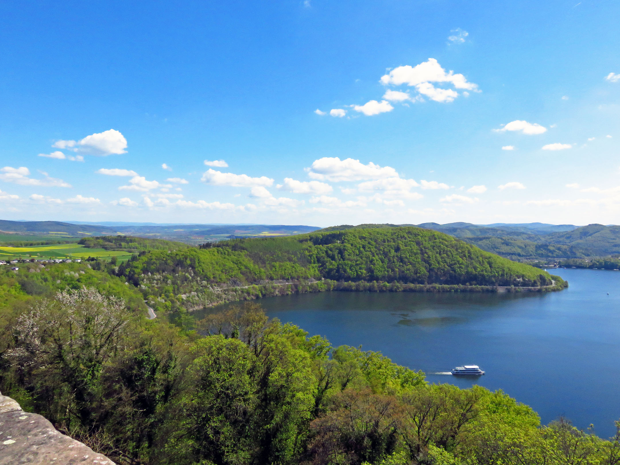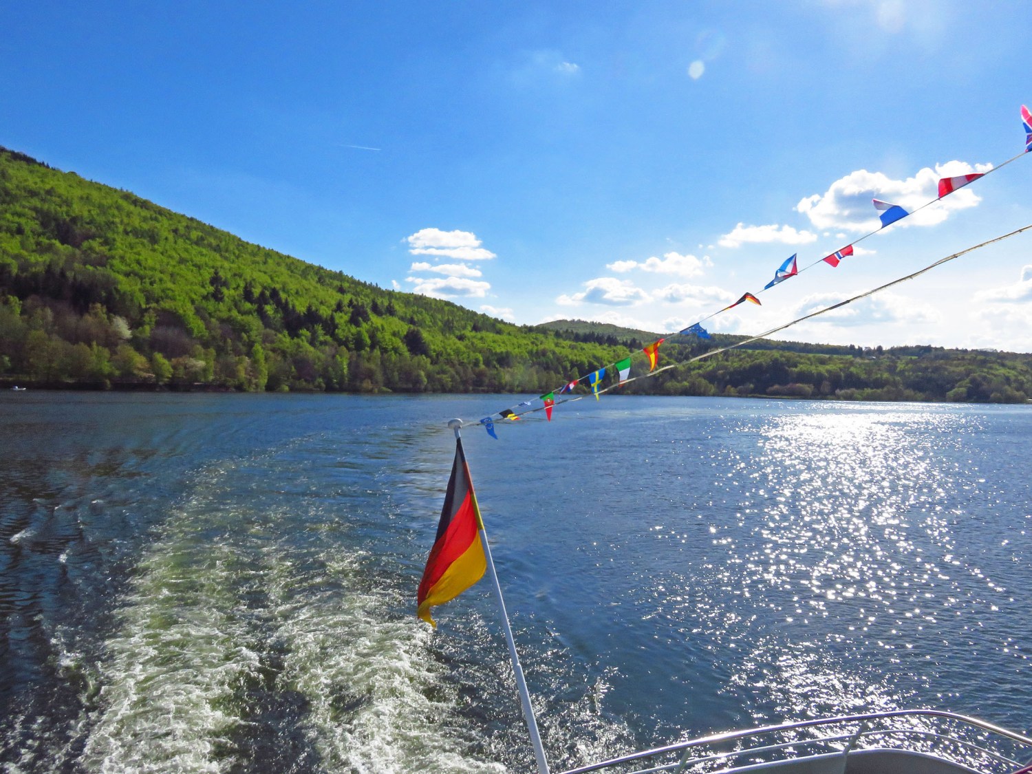 Down below, at the small marina, we all got aboard a romantic round trip on the lake, with unparalleled views of the deep blue waters, wooded banks, the impressively high dam, and of course, the Waldeck castle on the hill with its wall crenellations and a round tower under a tin roof.