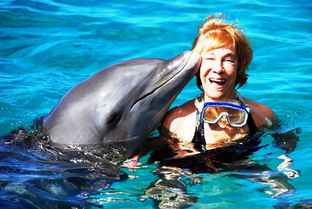 Now I don’t usually like watching animals perform tricks that are alien to their DNA for the amusement of tourists, but at the Dolphin Academy, the residents are treated with such loving care, I swam alongside them with minimal guilt. According to trainer Yvette, the dolphins are the first priority. “They are on a very light work schedule and every day, it varies. Like humans, they react better when their life is not all that predictable. And if for any reason they don’t want to perform -– perhaps they’re preoccupied with a personal family situation (I didn’t pursue that) -– the program is called off.” As if on cue, a participant related a past experience in which Dolphins used to give rides to people holding on to their fins. Nope, not any more — it was determined that it was too damaging to their dorsal fins and the dolphins didn’t like it so it was stopped years ago. I nodded; point well taken…one point for the dolphins.