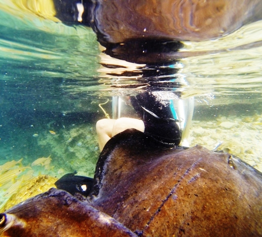 Their bodies were sleek and graceful, the skin soft to the touch, their demeanor welcoming even if a bit skeptical. Still, they were more used to this than I was. But I spread my arms out as instructed and flapped them in the water. Romeo and Paski, two of my dolphin snorkeling companions, then swam under my outstretched limbs, and we laid back into the water as though sunbathing. Then we went back to free swim.