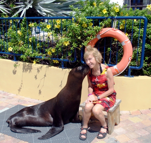 Back on land, my next animal rendezvous was of a more playful nature. I got to meet and greet Snapper, the sea lion. I learned the difference between sea lions and seals and watched Snapper do a seal imitation as he flopped along on his belly. Sea lions are much more genteel when they move — they walk on all fours. Using flippers, of course, but still… Snapper had a bit to say during our tete-a-tete but his vocalization unfortunately resembled a very loud, deep belch that tended to continue long after it was socially acceptable to do so. But still he was very cute -– and, like Romeo, very affectionate. Yup, I got another kiss. Between the two, I got more action that weekend than I remember occurring at the height of my dating career.