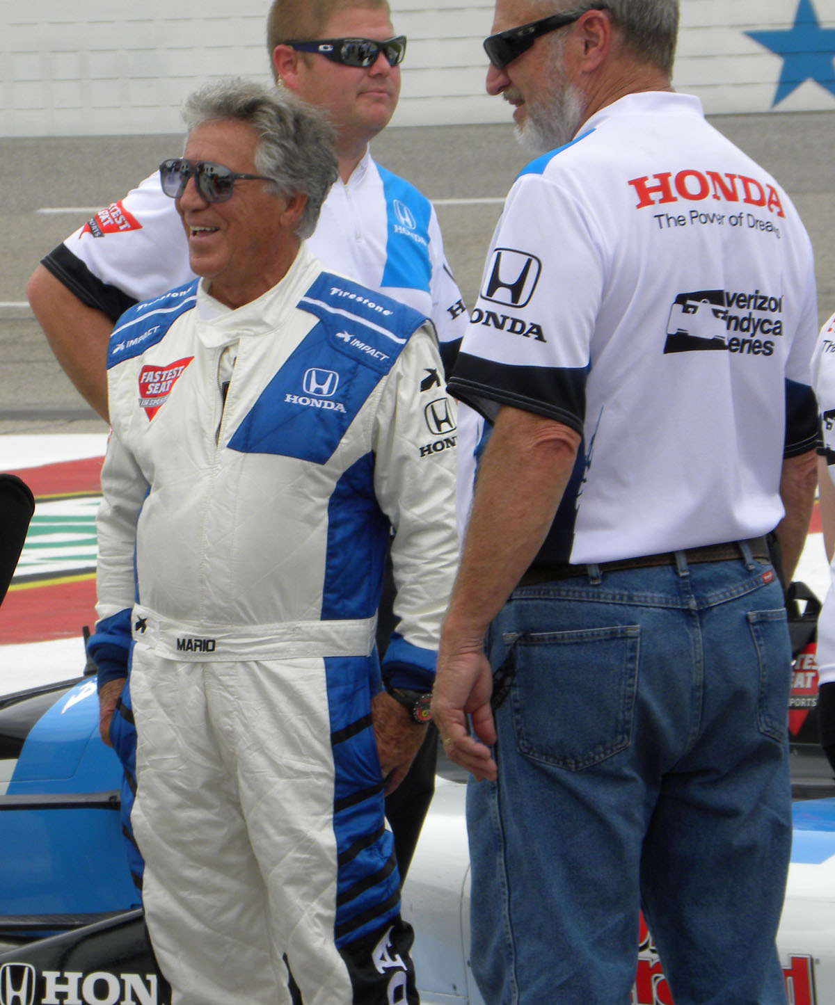 Around noon the cars were brought out of the garages in almost parade style while many cameras clicked. Everyone was excited and the day was beautiful! A little later the drivers came one by one on their small electric motor scooters and took their places beside their cars, ready in their pits at the track. Everyone awaited Mario Andretti to drive the Verizon double Indy Car with a fan in the first round of the track to begin the 1 p.m. race. But we all held our breaths because two different times a race driver rode in the red corvette to check the track for any tiny patch of moisture and both times, as we watched, the blower truck, came onto the track to assure the tiny damp patches were safe. Finally, about 2 p.m. everyone cheered as Andretti sped away in the Verizon Car to open the race!