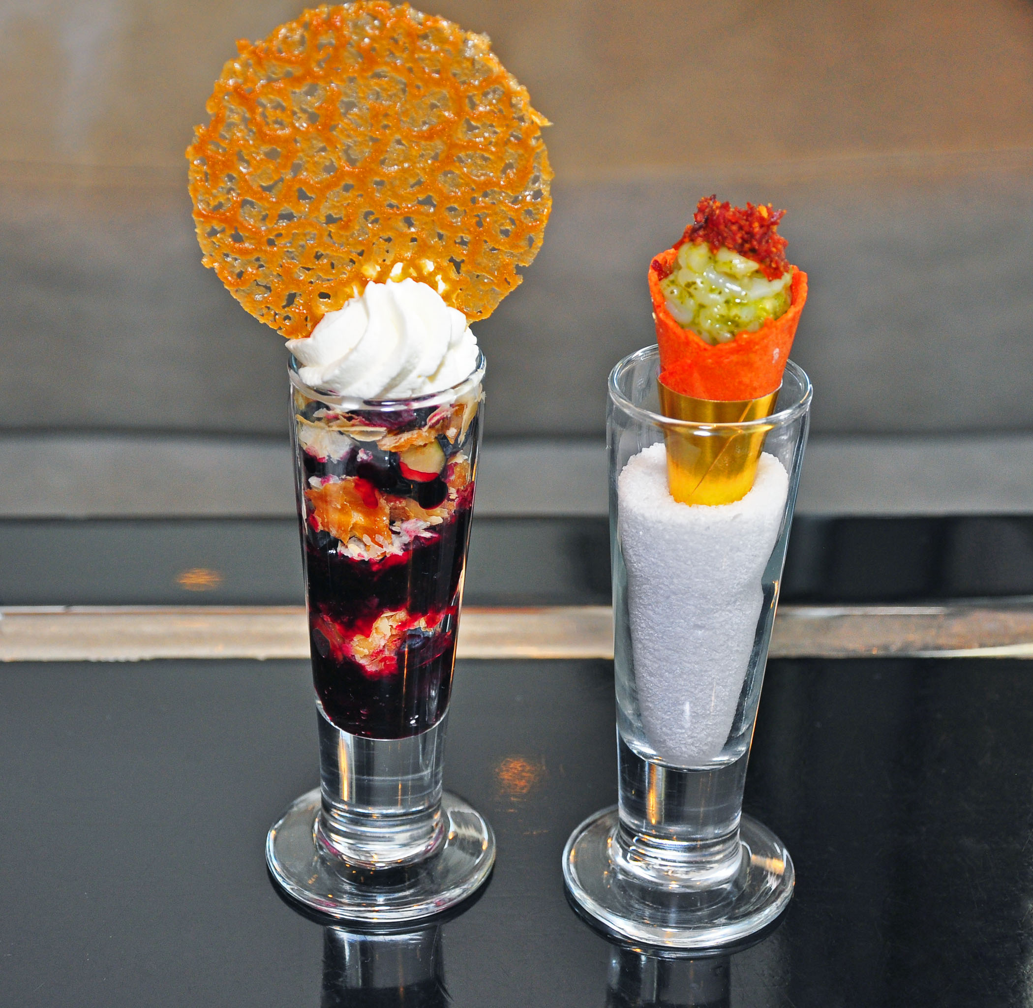 The latter – huckleberry & blueberry pie shooter; red berry gateau opera with Valrhona Jivara chocolate and hazelnut biscuit; Meyer lemon tower with citrus marshmallow and smoked sea salt; and deconstructed crispy fig scones with dark chocolate glaze.