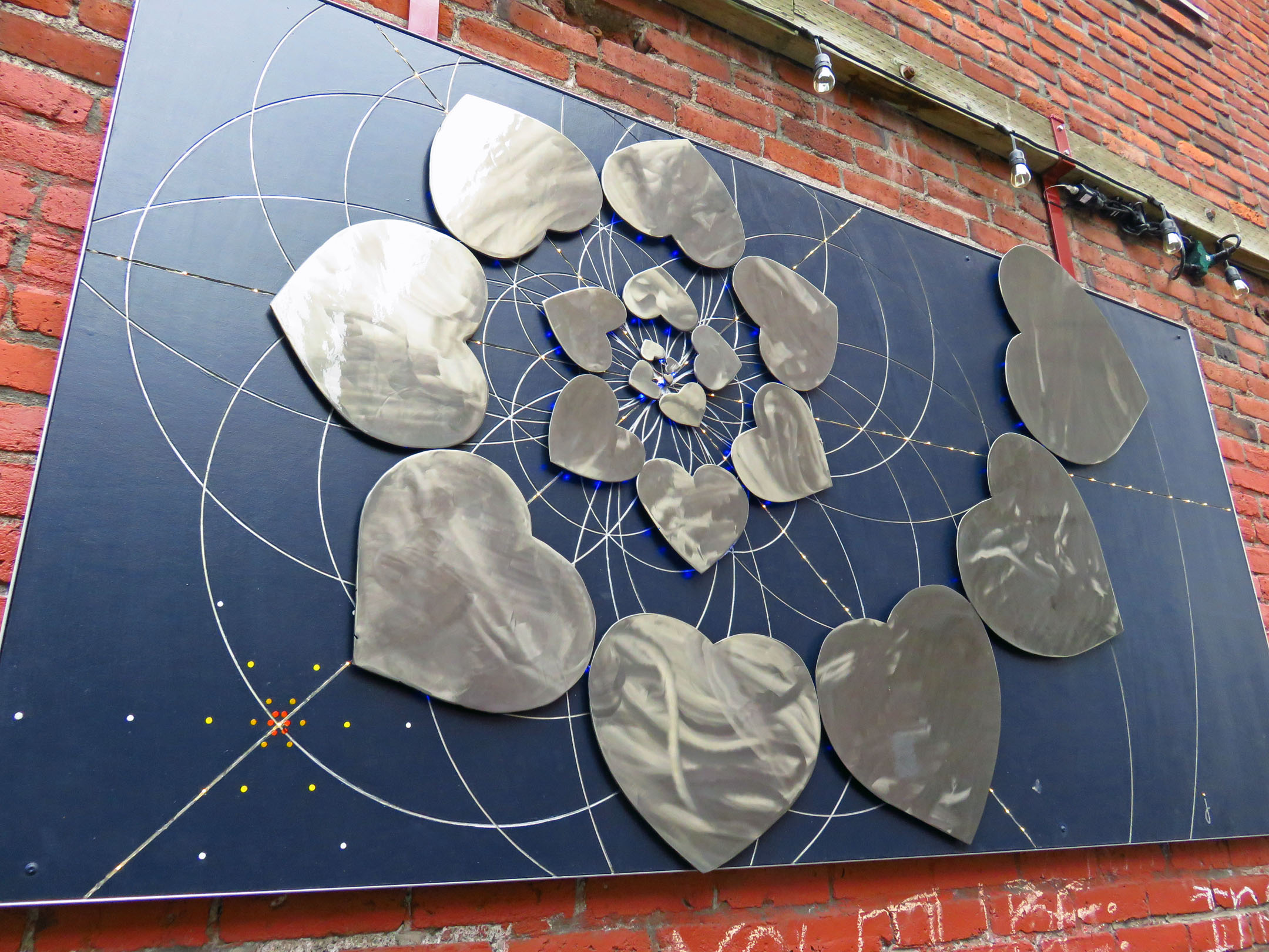 In a narrow alley next to the historic theater, my guide showed me a remarkable array of art pieces of the Tin Pan Alley Art Collection. Here I spotted my friend Judy Campbell’s fascinating installation, Tomas’ Riddle, made of wood and steel, lit by blue LED dots, and presenting a symbolic heart image repeated in a diminishing spiral pattern. As the artist herself explained, “It’s really about the mystery… The big unknown that we’re all a part of and connected through and experiencing but a lot of times not totally understanding. You know, when you look up at the night sky and you see those stars, you can’t imagine a beginning, much less an end. I was trying to convey a little bit of that sense of the ongoing, the infinite, the mystery that we’re a part of through art. And then I’m fascinated by fractals, which we see in nature.” Judy dedicated her work to her husband, Tom, also an artist.