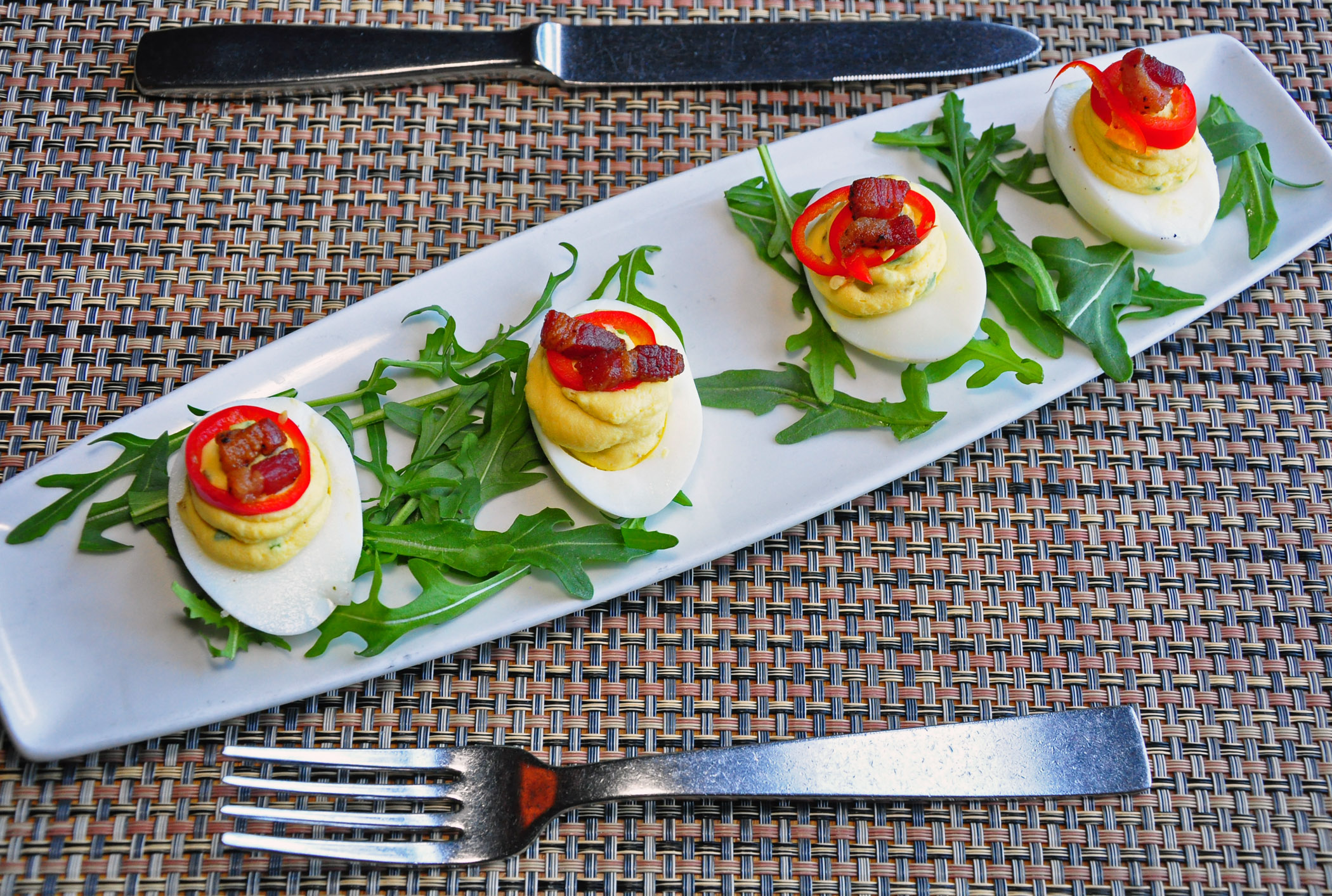 Notable dishes include deviled eggs with crispy pork belly and pickled chili; tater tots with bacon aioli, and hand-made pasta torchio with oxtail ragu, baby carrots, and horseradish crème fraiche.