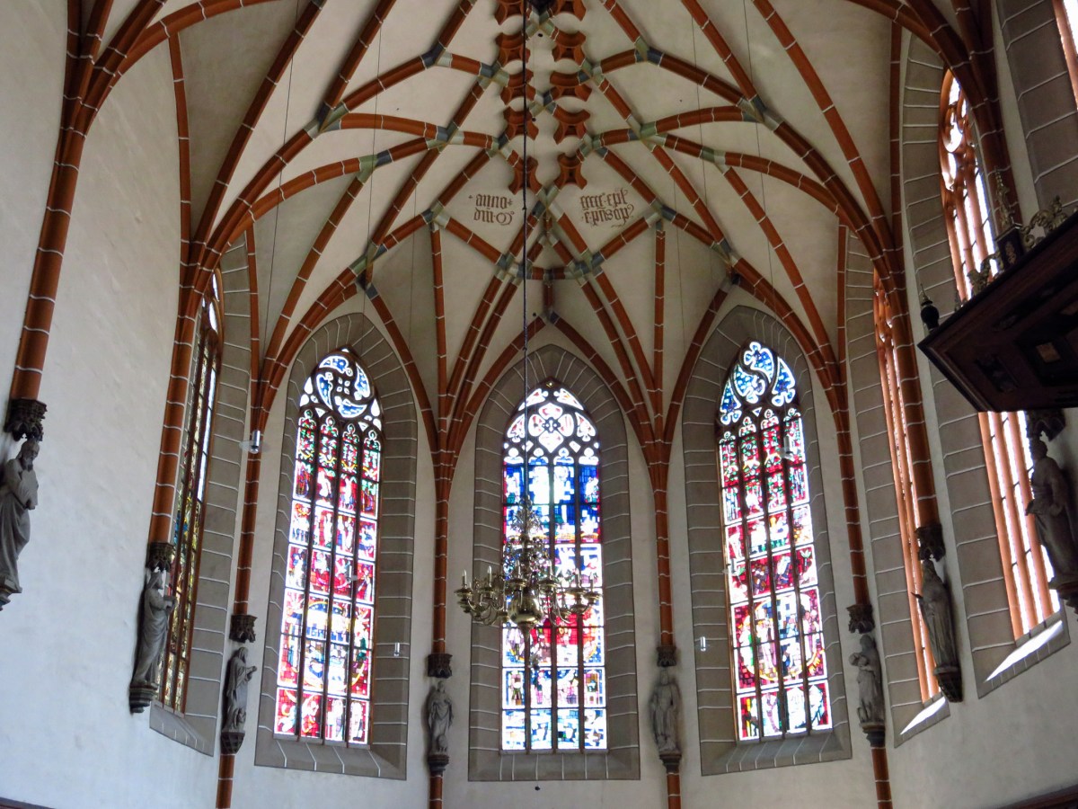 We also visited the late-gothic church of St. George with stained glass windows and a thin black clock tower that bears a graphic reminder of Memento Mori, and a historical building in which Luther rented a top floor room during one of his visits to the town.