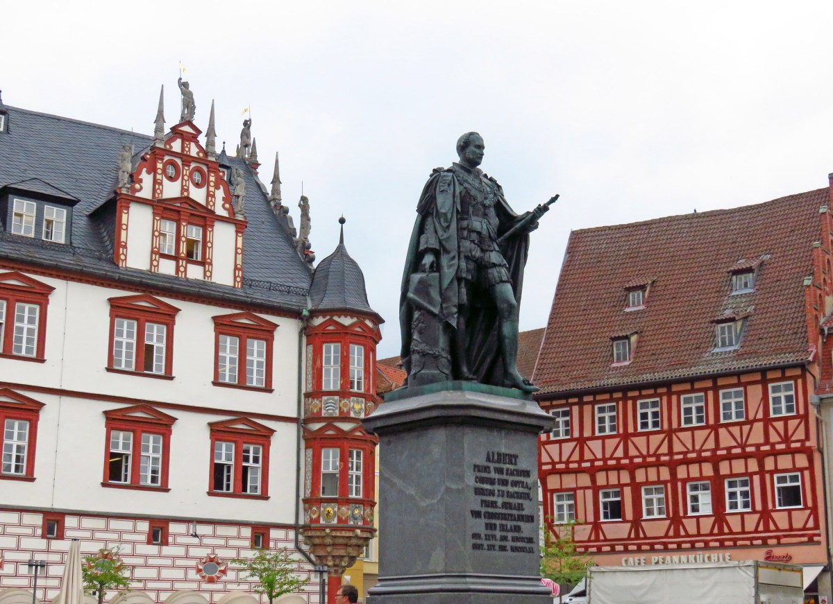 Transferring to the Bavarian Coburg we were about to embark on one of the best city walking tours in our group’s collective memory. Our guide, Beatrice Hoellein, who admittedly was born in Malaysia, married a German, and found her true vocation in leading multi-lingual tours in and around Coburg, started her amazing presentation standing at Marktplatz in front of the 1865 monument to Albert, Prince Consort of Great Britain from the House of Coburg. She made a reference to Coburg’s own “Brexit” when the city, located on the border of the two states, voted to drop Thuringia and join Bavaria in 1920 after a state-wide referendum. Our guide then pointed to a depiction of the head of St. Moriz on the city’s coat of arms, on many building walls, and on manhole covers. She explained that the legendary Coburg Moor was the city’s patron saint, and that Coburg’s main church was also named after him.