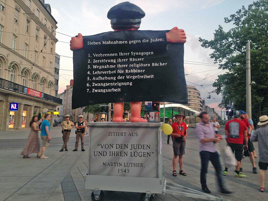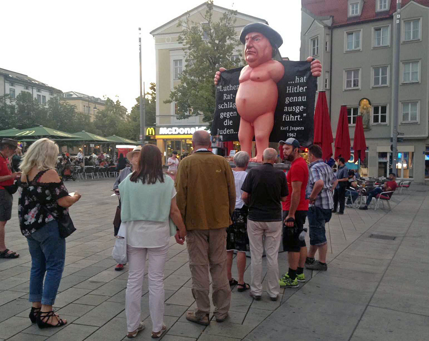 After a lavish farewell dinner at Riegele Wirtshaus, when our group was heading to the hotel, we encountered a police-protected street demonstration emphasizing Luther’s adamant refusal to grant others the same religious freedom he proclaimed and insisted upon for his own followers. An effigy of Luther depicted as a flasher, and quoting his well-known insights, “Burn their synagogues, destroy their religious books,” etc. etc. was taken through the streets of Augsburg by a group of protesters, supported by some passersby – a great testament to the freedom of speech, alive and well in the City of Reformation.