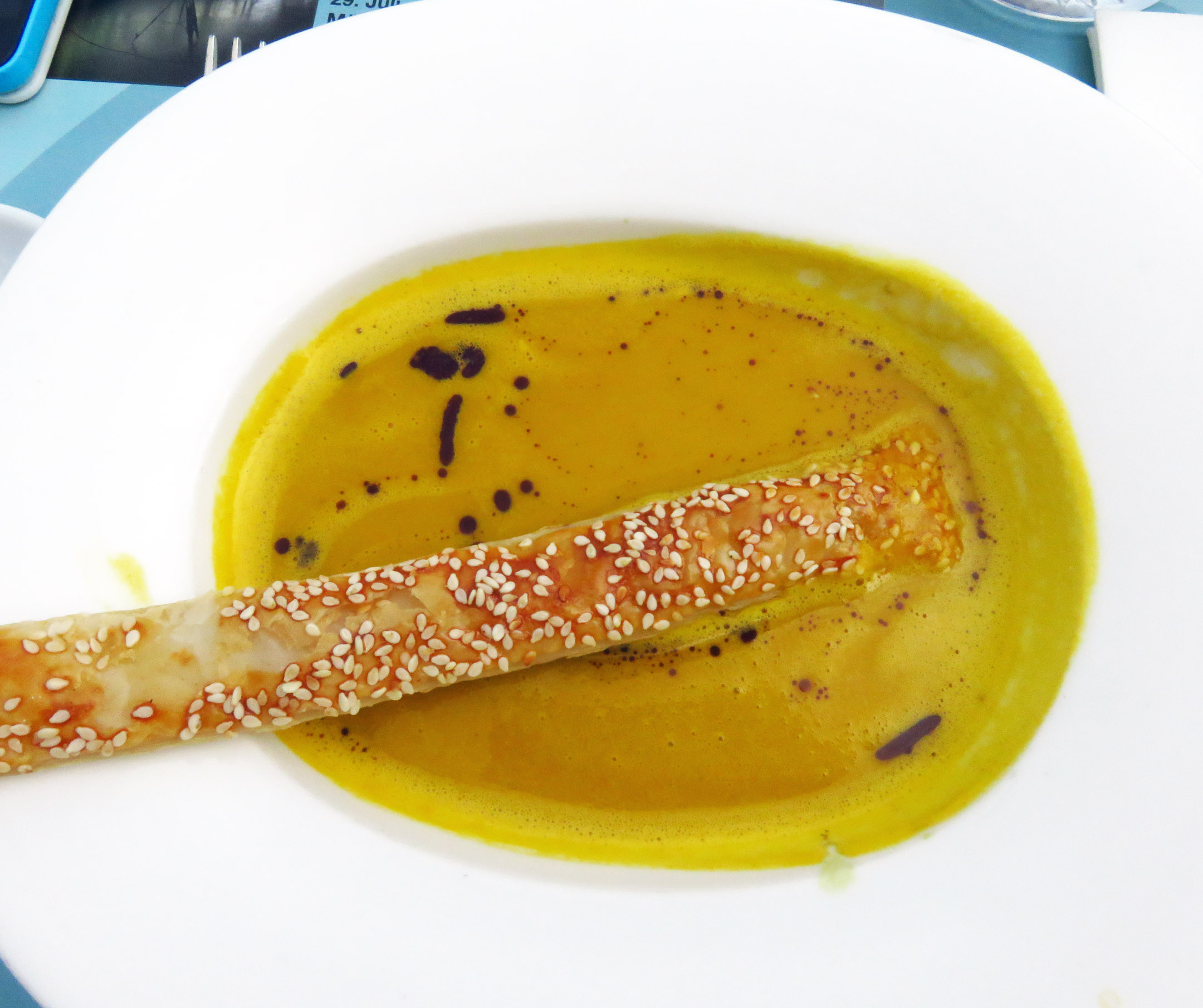 Lunch on an outside terrace of M32 on a hill by the Museum of Modern Art, with spectacular views of Salzburg, presented yet another version of pumpkin soup with pumpkin seed oil, giving us a great opportunity to compare different preparations of this popular seasonal dish, and pick the favorites.