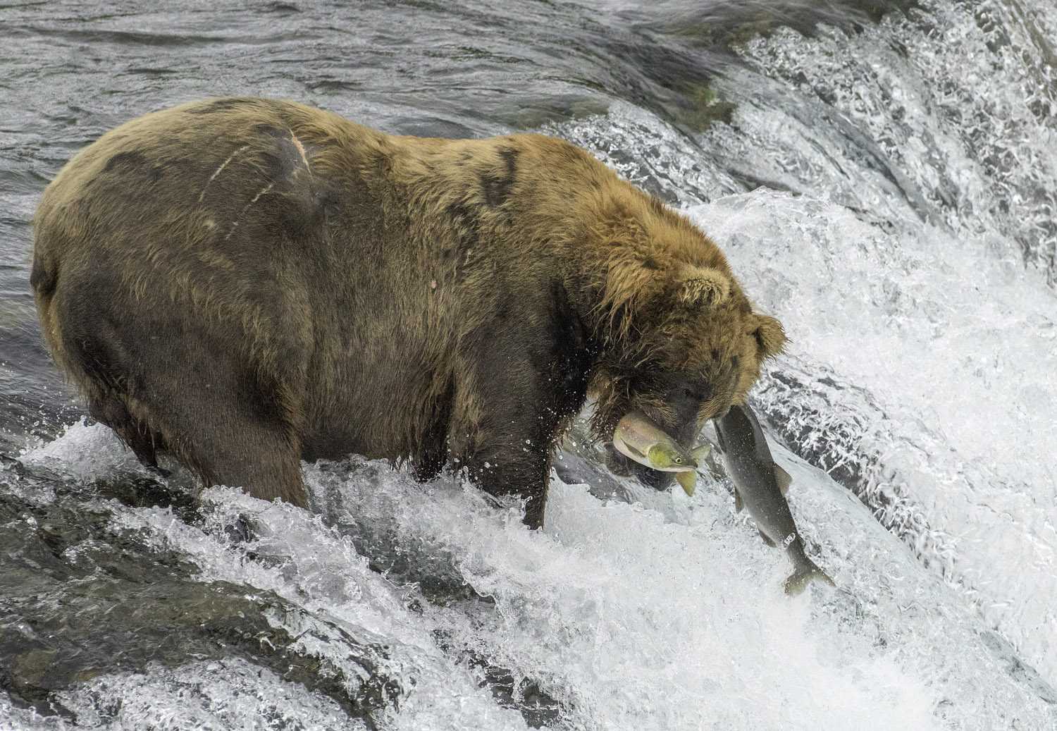 There are 2,200 Alaskan brown bears inhabiting Katmai National Park. They are called Grizzly Bears in the lower 48 states of the U.S. During the summer the salmon return to the rivers of Alaska by the millions. The bears of Katmai have lost a lot of their body weight while hibernating are looking for food and a lot of it. Sow bears may have cubs to feed and to teach how to fish. This brings them to the Brooks River and especially Brooks Falls in Katmai National Park to find their salmon feast of Sockeye in June and July and Silver salmon in late August and September. Flying in a small plane is mandatory if you want to get there.
