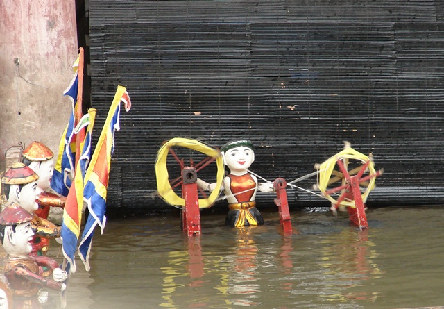 Water puppets and Vietnam are synonymous. I have enjoyed the shows in Hanoi’s puppet theater but seeing the show in Thanh Ha village was special. Water puppetry dates back to the 11th century when it originated in the Red River Delta villages like Thanh Ha. The puppeteers stand in waist-deep water hidden by a screen. They control the lacquered wooden puppets by an unseen bamboo rod so that the puppets appear to dance on water accompanied by drums, cymbals, and gongs. The puppet vignettes relate traditional folktale complete with a fire-breathing dragon plus day-to-day activities such as farming and fishing. The show was schedule for Pandaw guests but it drew the local people also, especially the children who took delight in the unexpected, free performance. At the end of one of the shore trips we were entertained on the wharf by a lion dance, an integral part of the Vietnamese New Year’s celebration. The Pandaw RV Angkor crew thinks of everything. They brought chairs from the vessel so we could enjoy the show in comfort. The lions, two people in one costume, are incredibly agile as they perform especially when the lions, one person on the shoulders of their partner, have to jump “battle” to get the lettuce that is held on a high spot. It is a traditional part of the dance as it portends good luck for the coming year.