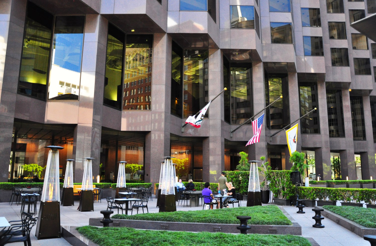 “We have meticulously researched and developed a socially safe environment for you to enjoy creative cocktails and delicious food in a heated, outdoor full service garden,” states the restaurant’s website inviting eager Bay Area diners to the 100-seat plaza (Radeff Design Studios) surrounded by the glass-and-granite walls of downtown skyscrapers and laid out like a Baroque garden with geometrical lawn beds, neatly trimmed hedges, clusters of tall bamboos and standup heaters between the widely distanced custom-made concrete tables (by Acme Scenery).