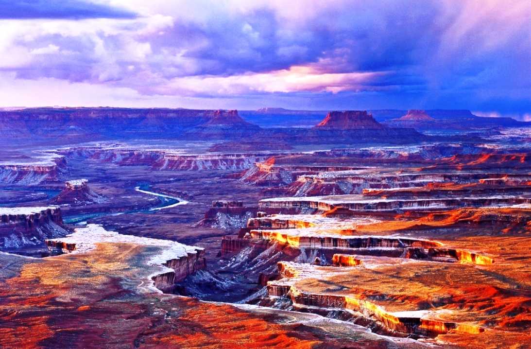 Nearby Canyonlands requires a 4-wheel drive vehicle –- preferably with a driver. At 6000 feet, the view from Island in the Sky looks down at cliffs 2000 feet tall, arising out of a magnificently gouged and painted landscape.