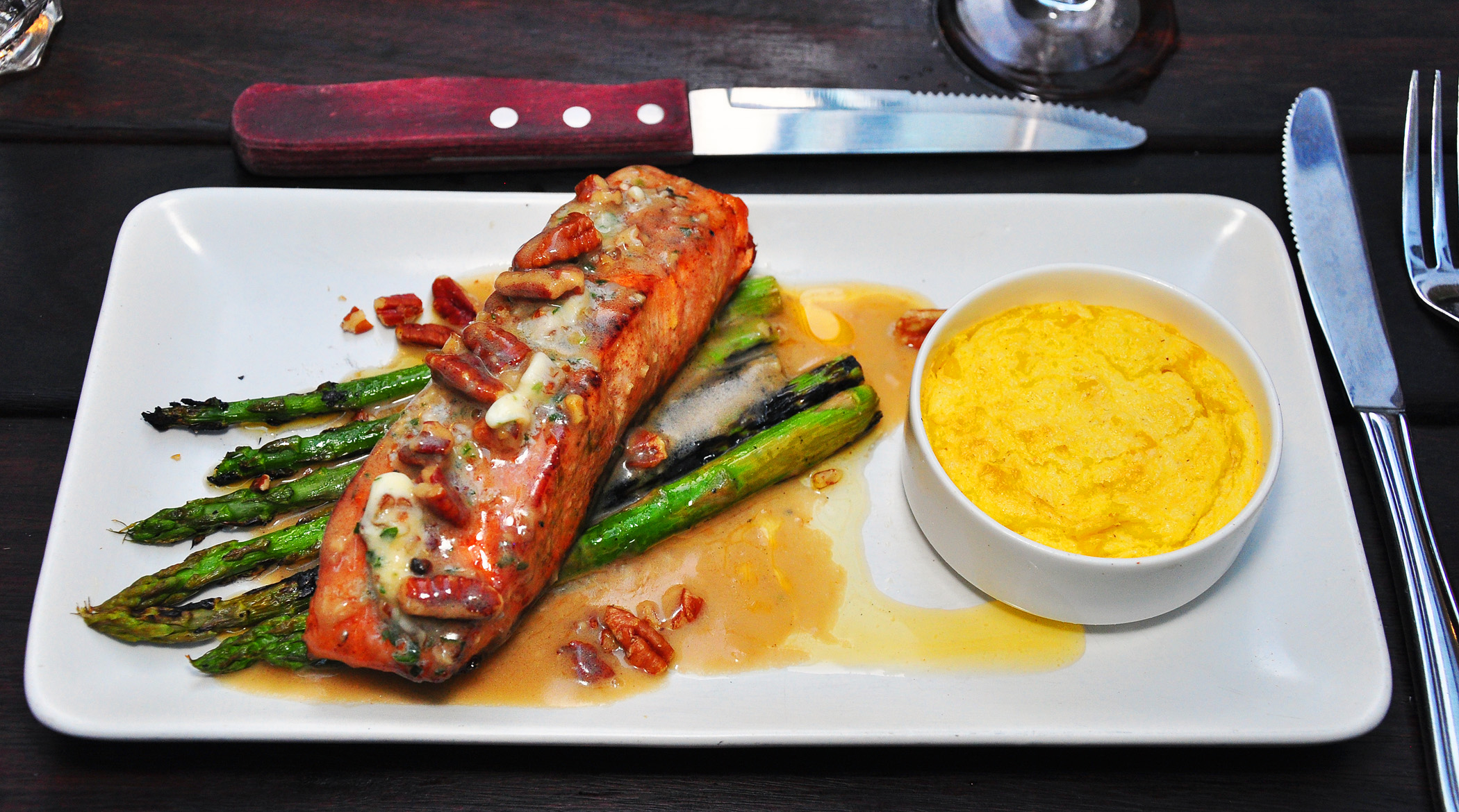 The new menu items, dedicated to Paul Prudhomme’s Southern staples used to be served at K Paul’s include excellently authentic shrimp and crawfish gumbo with okra, scallions, and Carolina gold rice, especially good with a side of signature jalapeño cornbread, served in a hot cast iron skillet; delectable BBQ gulf shrimp with Worcestershire sauce on garlic toast, and bronzed King salmon with grilled asparagus, sweet corn bread, and pecans Meuniere.