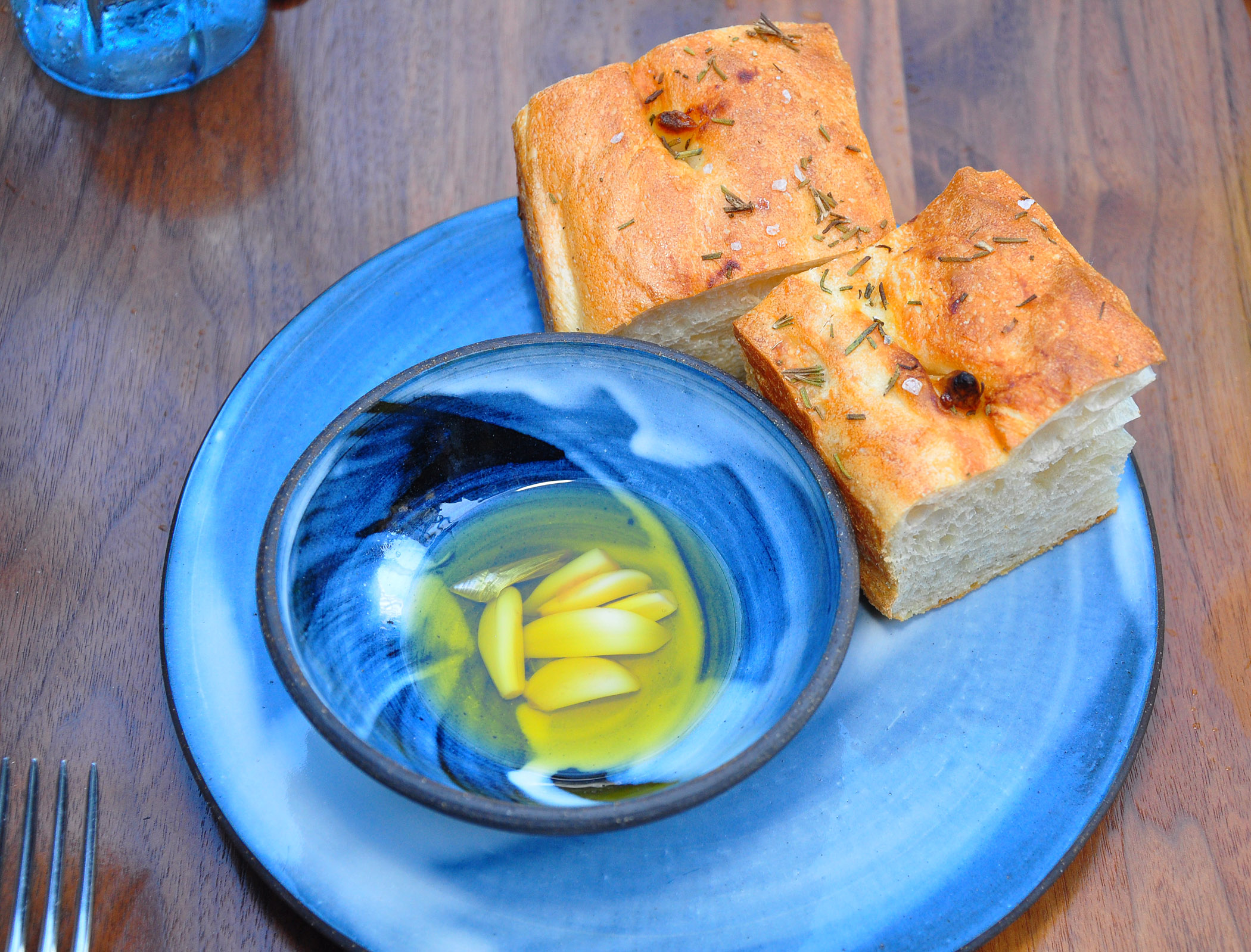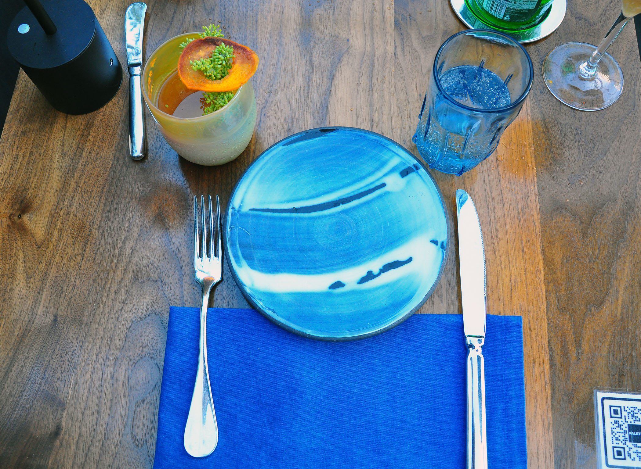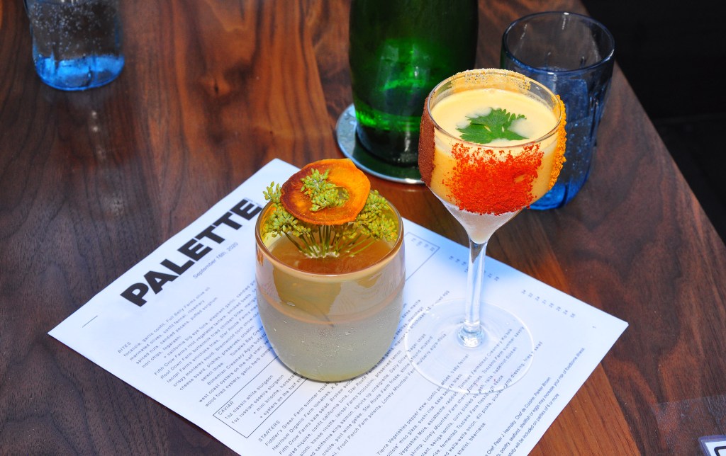 Custom-made blue water glasses and artful blue ceramic dishes create an atmosphere of art appreciation even before the food arrives. A mind-boggling list of fantastically creative cocktails is a separate artwork, worth some thoughtful contemplation (note an ice cube with an etched Palette logo on top).