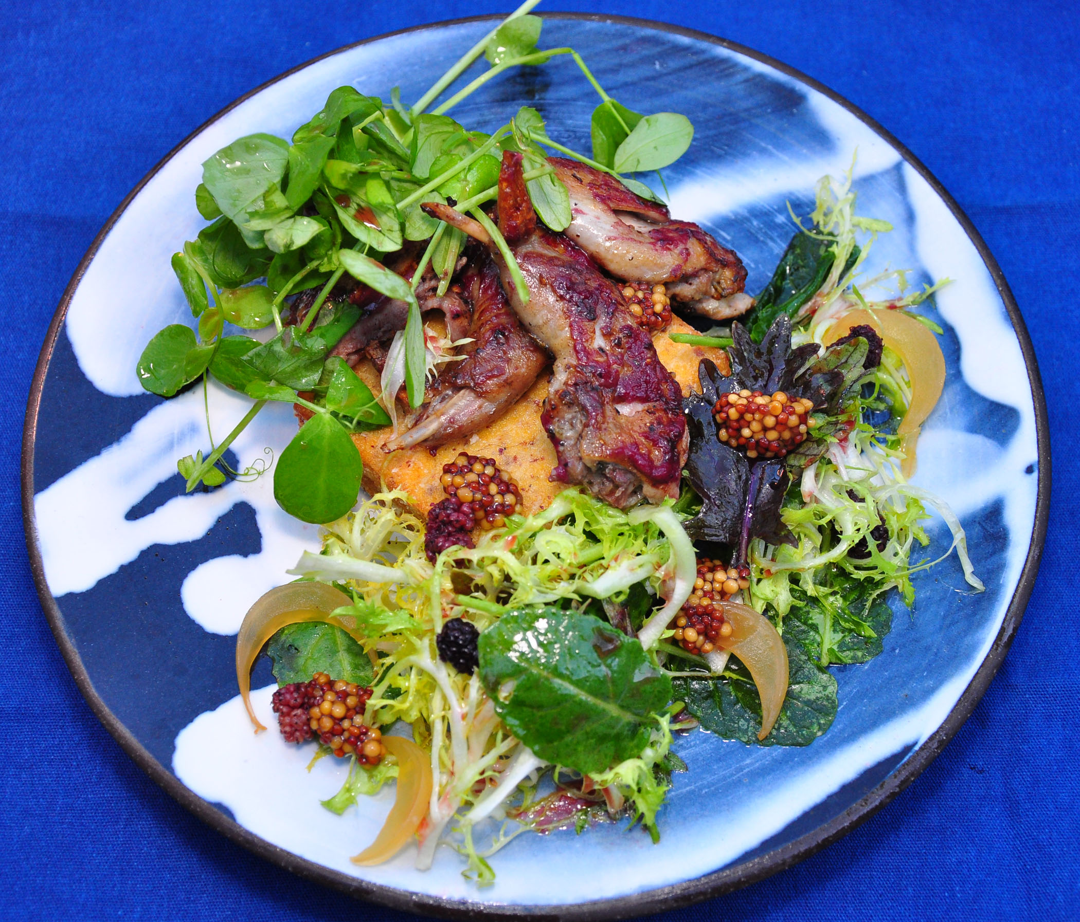 On the Starters menu the shining stars are house-made pâté en croute with port wine gelée and pistachios, Star Route Farm frisée, and stone ground mustard, and grilled quail with amazing Lonely Mountain Farm mulberry-jalapeño glaze, Front Porch Farm polenta, fresh pea shoots and other greens on a side.