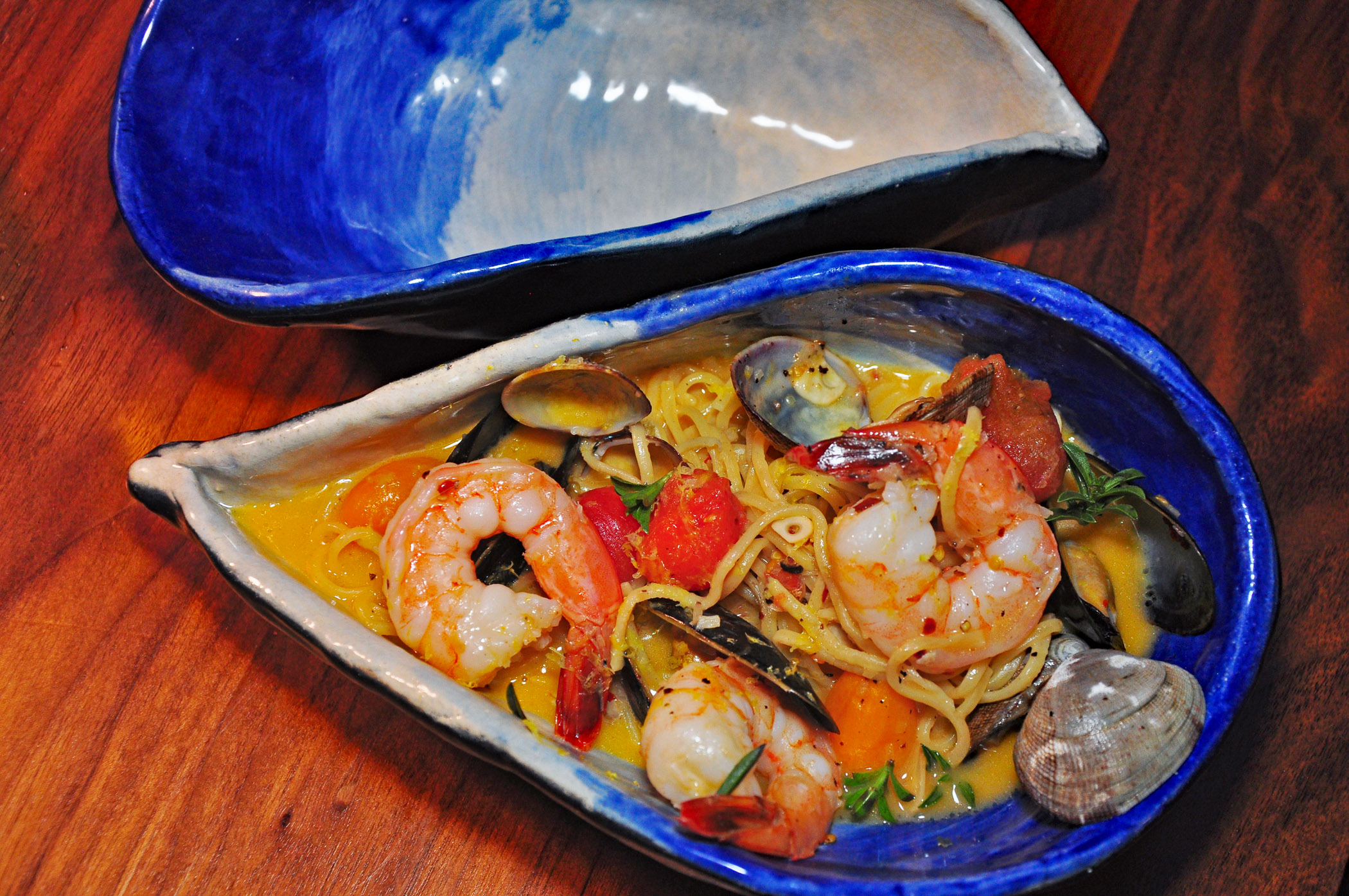 The many wonderful Mains include grilled Bay halibut with Tierra Vegetables pepper stew, confit potatoes, and baby fennel, and the most delightful, with ever so slightly lemony flavor seafood linguine with mussels, clams, shrimp, stewed Lonely Mountain Farm cherry tomatoes, and Toscano Farm summer savory.