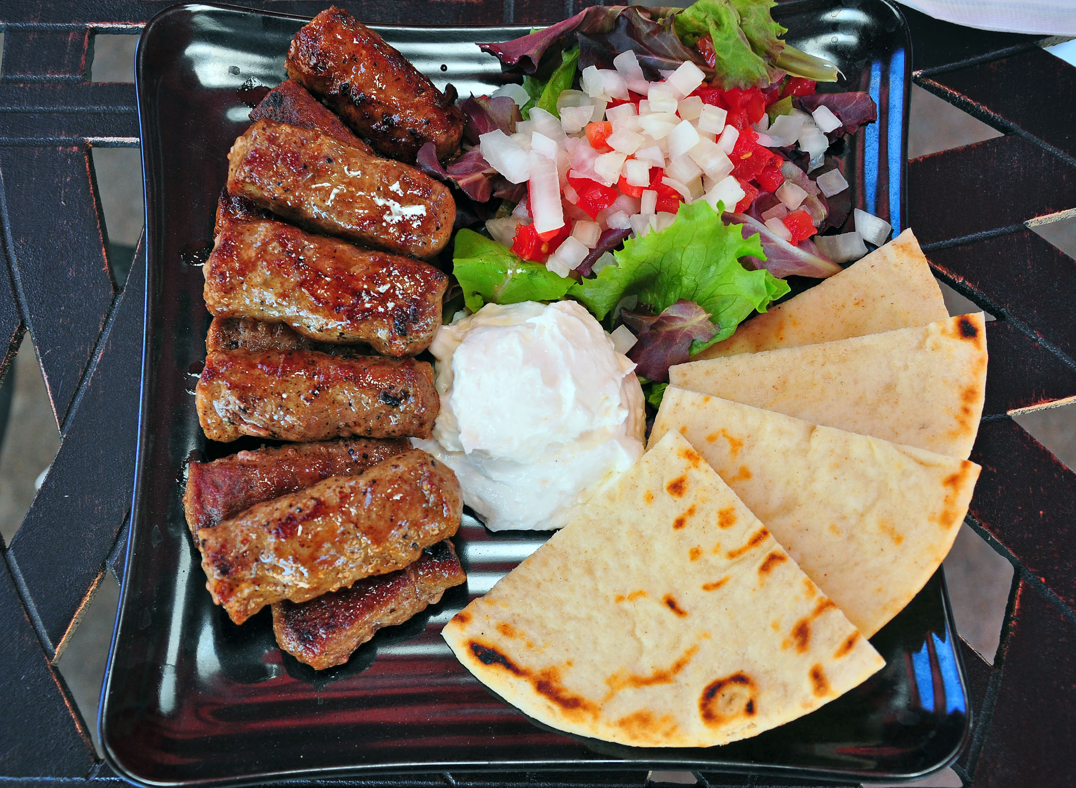 Our tasting included 2019 Viognier, 2018 Montagna Mare (a proprietary blend of barbera and sangiovese, 2017 Tempranillo (an excellent 100% single varietal), 2017 Cabernet Sauvignon, and 2018 Mountain Zinfandel (the most popular crowd pleaser), accompanied by a housemade Italian sausage pizza with mozzarella and parmesan cheese from a wood-fired oven, and housemade lamb sausage served with pita bread, kajmak (fresh unripen cheese), chopped onions, lettuce & tomato.