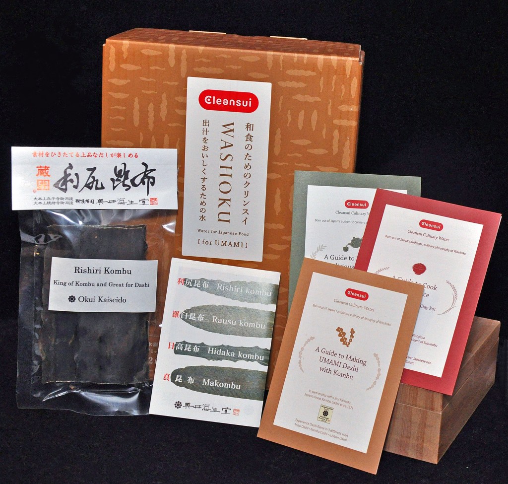 In a box that landed at my doorstep, there were a Cleansui Culinary Water pitcher with a filter, packaged Rishiri Kombu of Okui Kaiseido (a company famous for its high quality dry seaweed), a slice of wagyu beef, and a serving of handmade Udon noodles along with soy sauce and other condiments.
