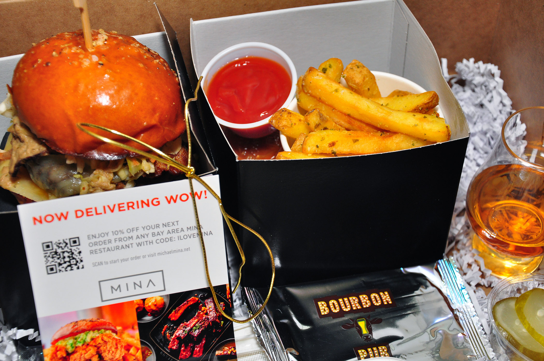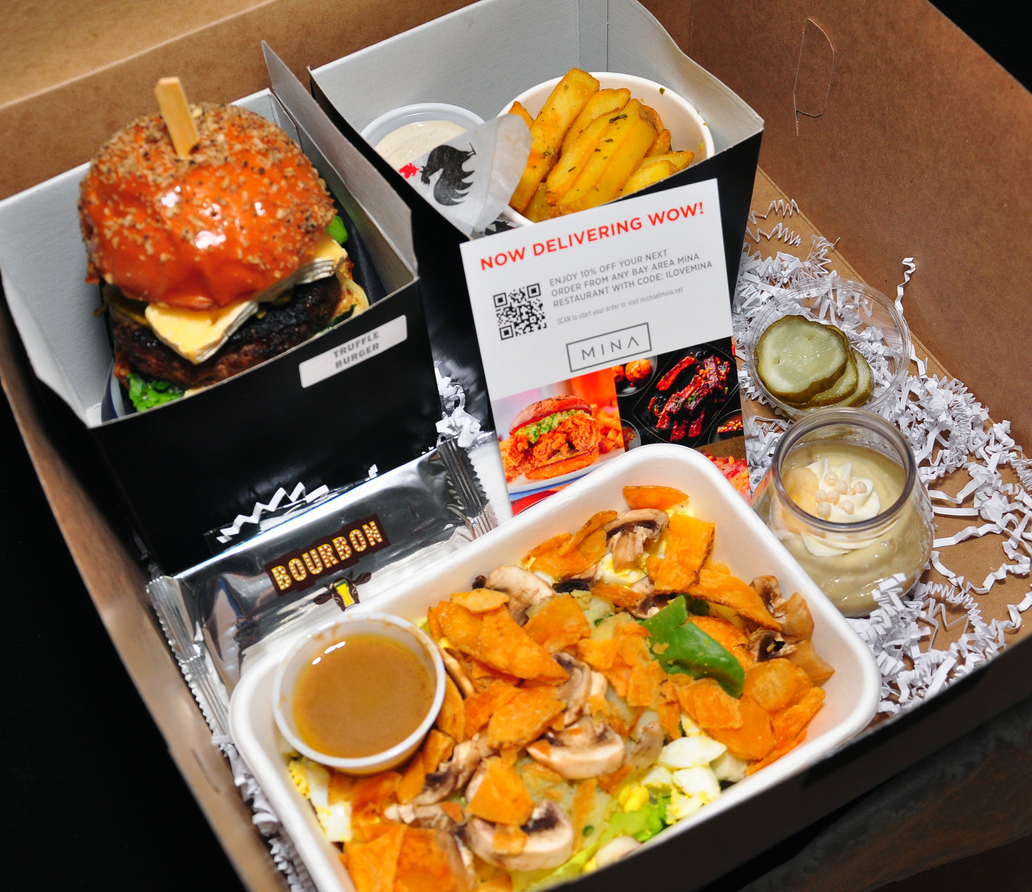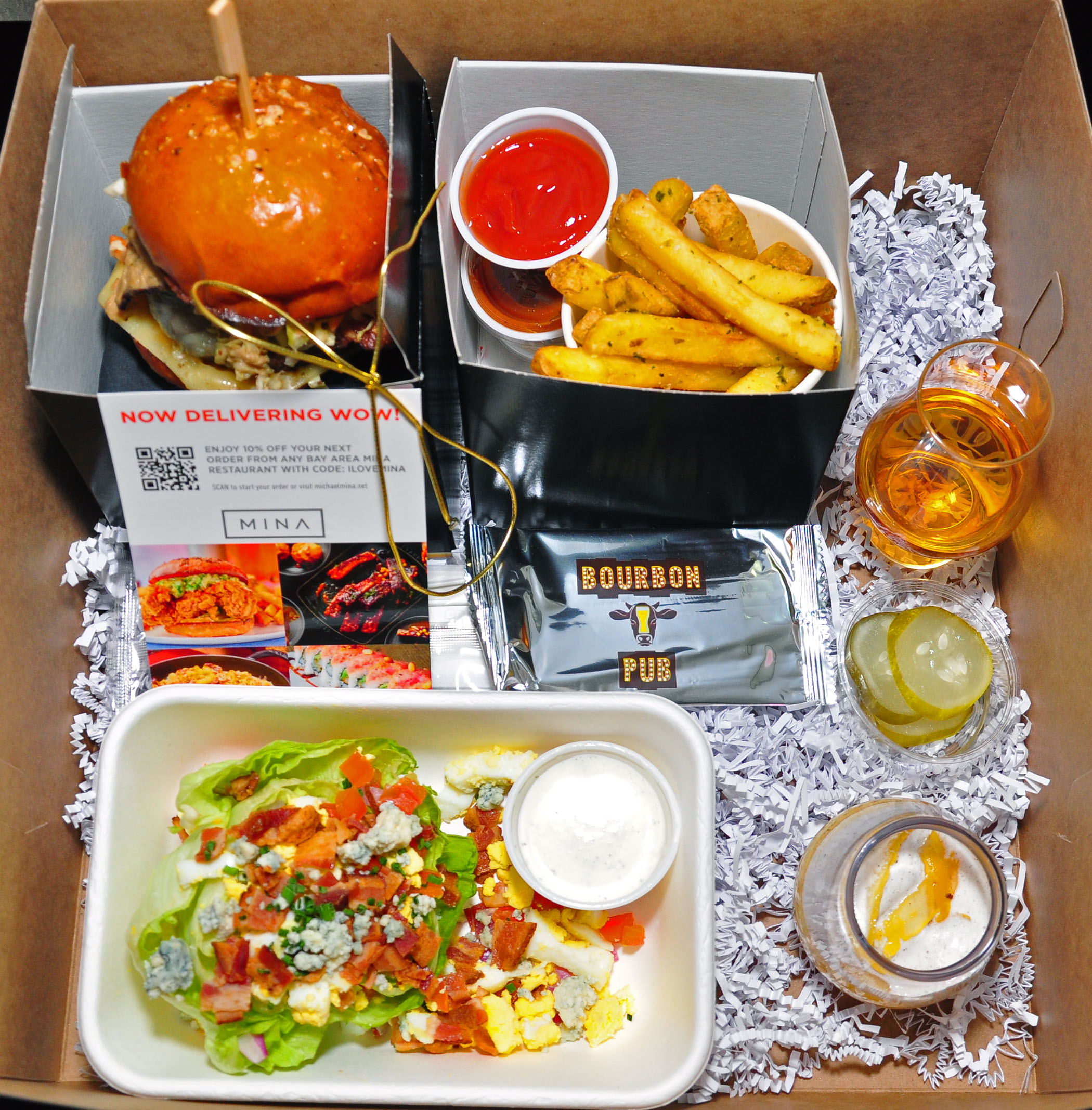 Order a BBB Burger Experience for an aesthetically pleasing and delicious presentation in a big bakery box that includes burgers and duck-fat fries in separate smaller black boxes tied with golden ribbons as well as a salad with dressing, pickles, and a dessert in a pudding form in a little jar.