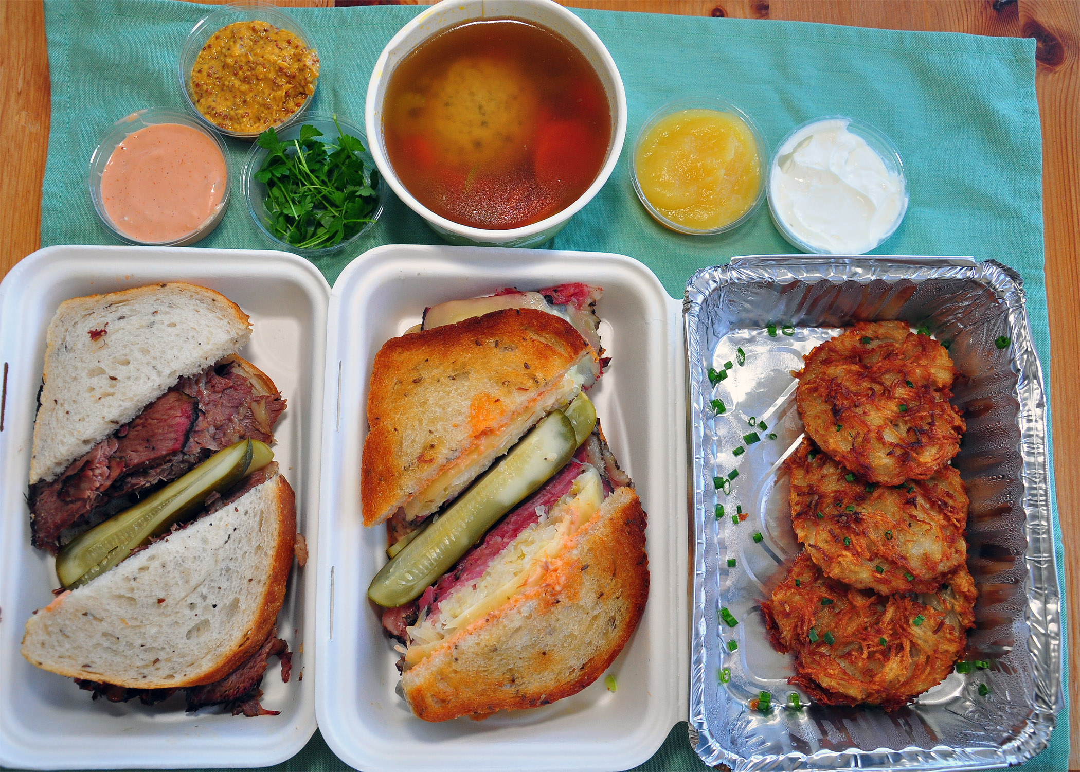 Squarely focused on takeout and delivery, the brainchild of Michael (“Mike“) Dellar and One Market Chef Mark Dommen follows in the footsteps of the traditional Jewish delicatessens, offering the staples of this highly popular cuisine—lox on bagel, matzo ball soup, potato latkes, smoked brisket and pastrami sandwiches—all the comfort foods thusly named for a very good reason.