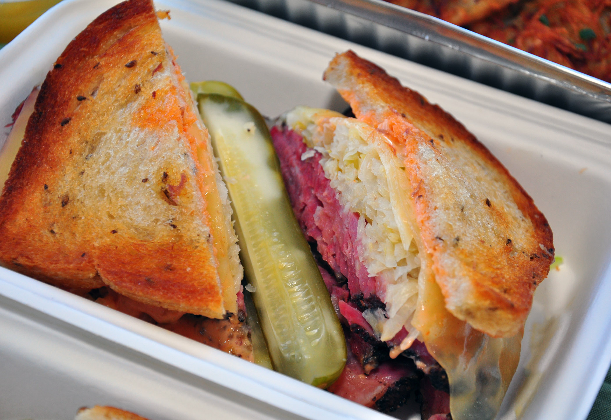 A Big Sandwich of 12-hour smoked brisket is served on twice-baked rye with a dill pickle on a side, and a Signature Sandwich of Pastrami Reuben from the griddle is stacked with Swiss cheese and sauerkraut, with Russian dressing on a side to be added when ready to eat.