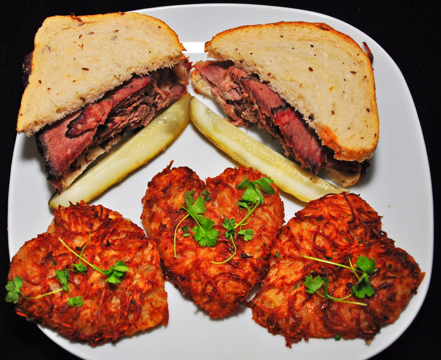 Plump golden-brown latkes (potato pancakes) are as good as they come, with traditional sides of sour cream and apple sauce. For Valentine’s Day, from February 10 through 13 your order can be enlivened with heart-shaped latkes, special for the occasion.