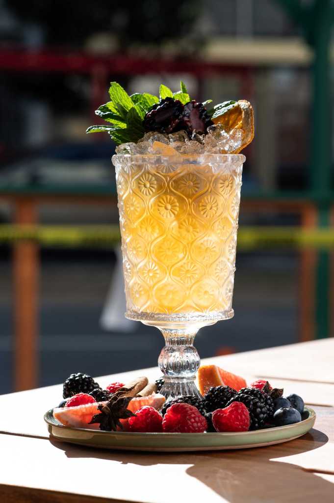 The house special, a delightful Red Window Cobbler a.k.a the best cobbler in San Francisco, made with a Red Window Sherry Blend, Tangelo Cordial, Peach, Fig, Angostura, and Black Walnut comes in a crystal cut glass, adorned with dried citrus, fresh mint leaves and berries.