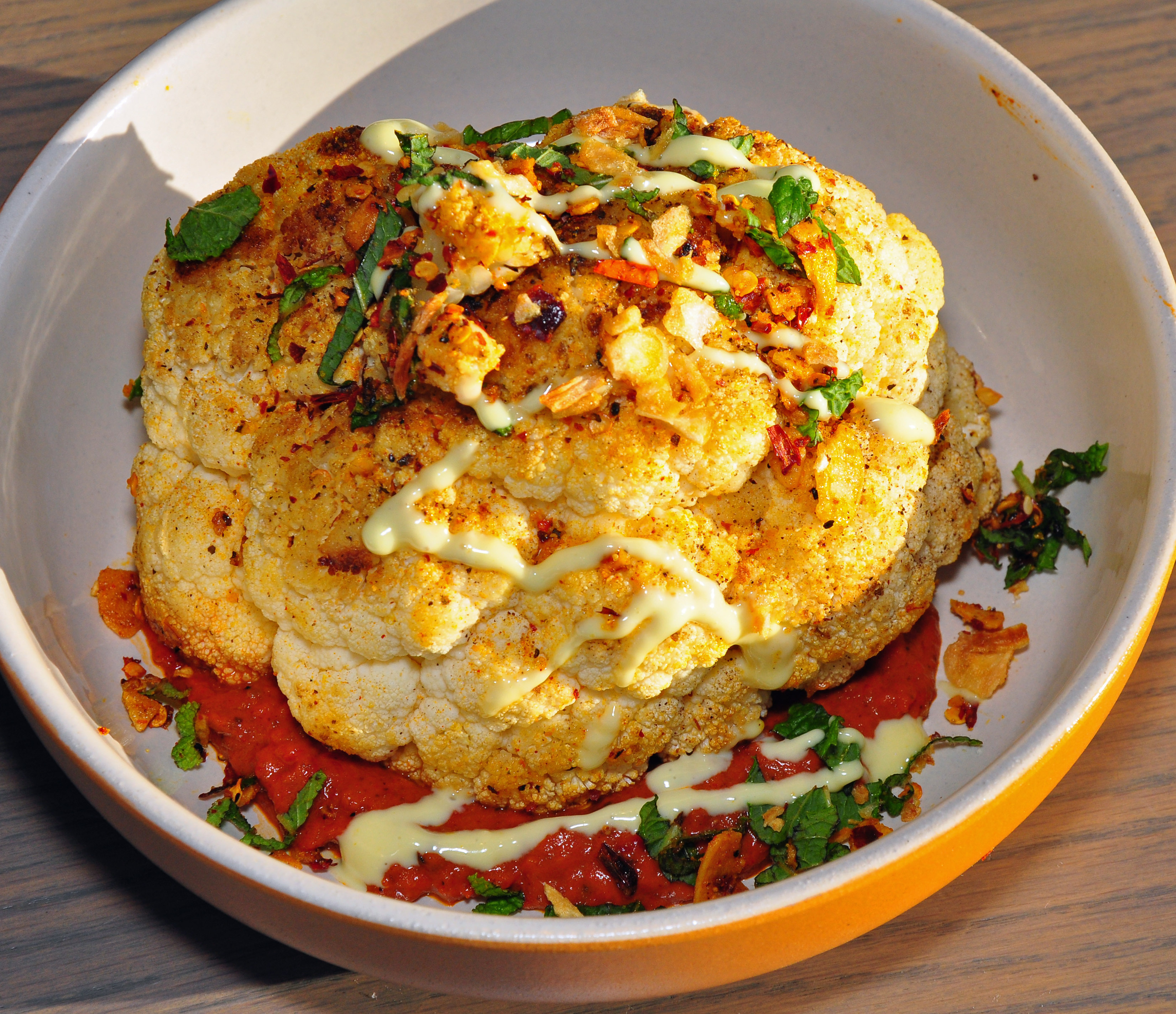 The Small plates menu features several standouts, like Ahi Tuna Tartare with wild caught fish, avocado, shallots, tomatoes, cucumbers, farro, pickled Fresno chilis, and crispy sesame wontons to scoop the brightly colored mixture, and Soup of the Day (in our case, the warm and comforting potato leak with bacon). Other must-haves include Bone Marrow with roasted Roma and cherry tomatoes, horseradish cream, sourdough toast, microgreens, and balsamic reduction, to which you can add whiskey luge, extra bone, or extra toast for easy sharing, and a slow roasted, faintly crisp Petaluma Farms Cauliflower with romesco sauce, lemon pepper seasoning, mint, chili flakes, garlic butter, and fried shallots.