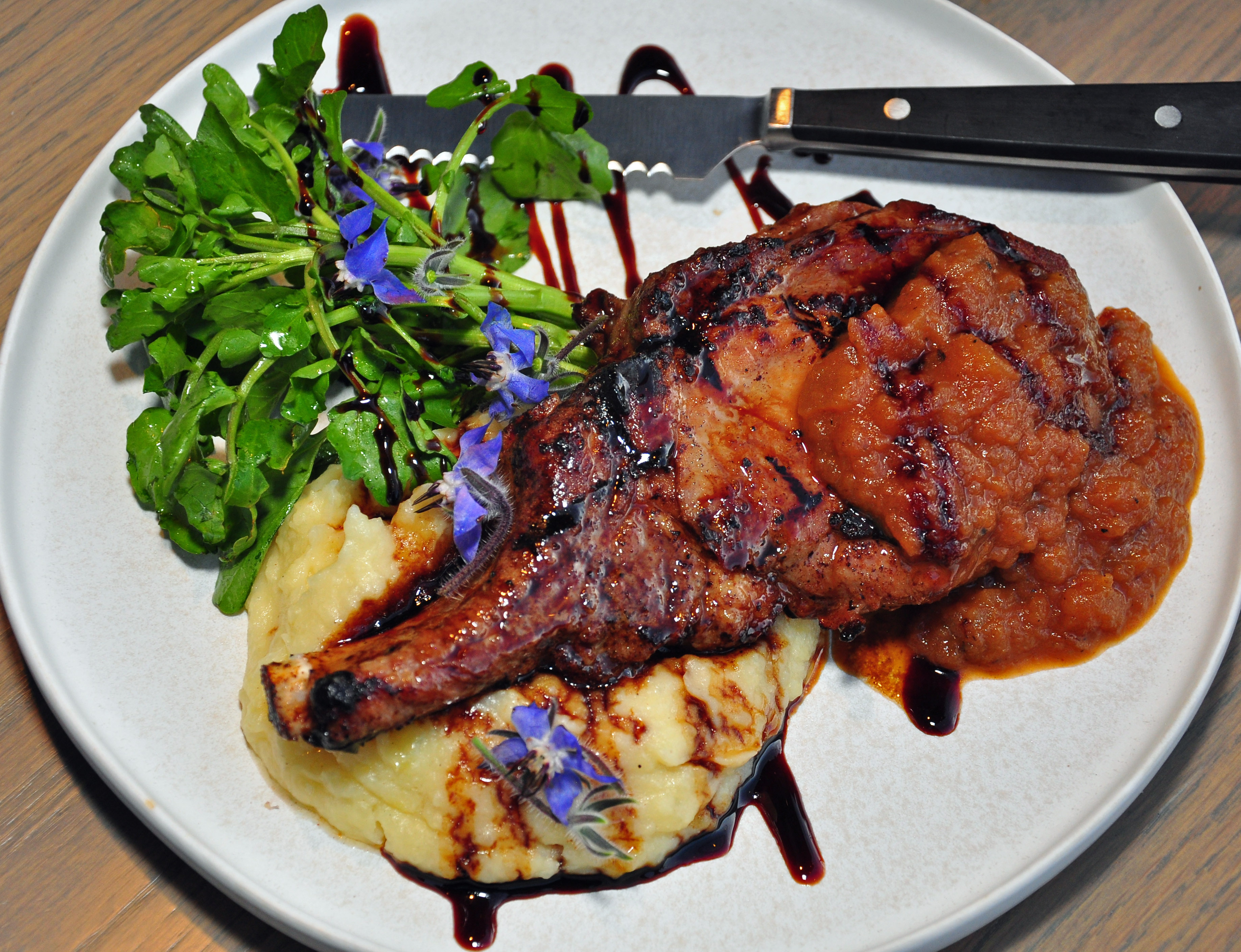 From the Carnivore section of the menu come highly satisfying Braised Short Ribs & Grits (braised for seven hours, and garnished with grilled rapini, horseradish cream, fried shallots, and balsamic reduction) and grilled Pork Chop & Apple Sauce with mashed potatoes, chef’s apple sauce, pomegranate reduction, and watercress salad.