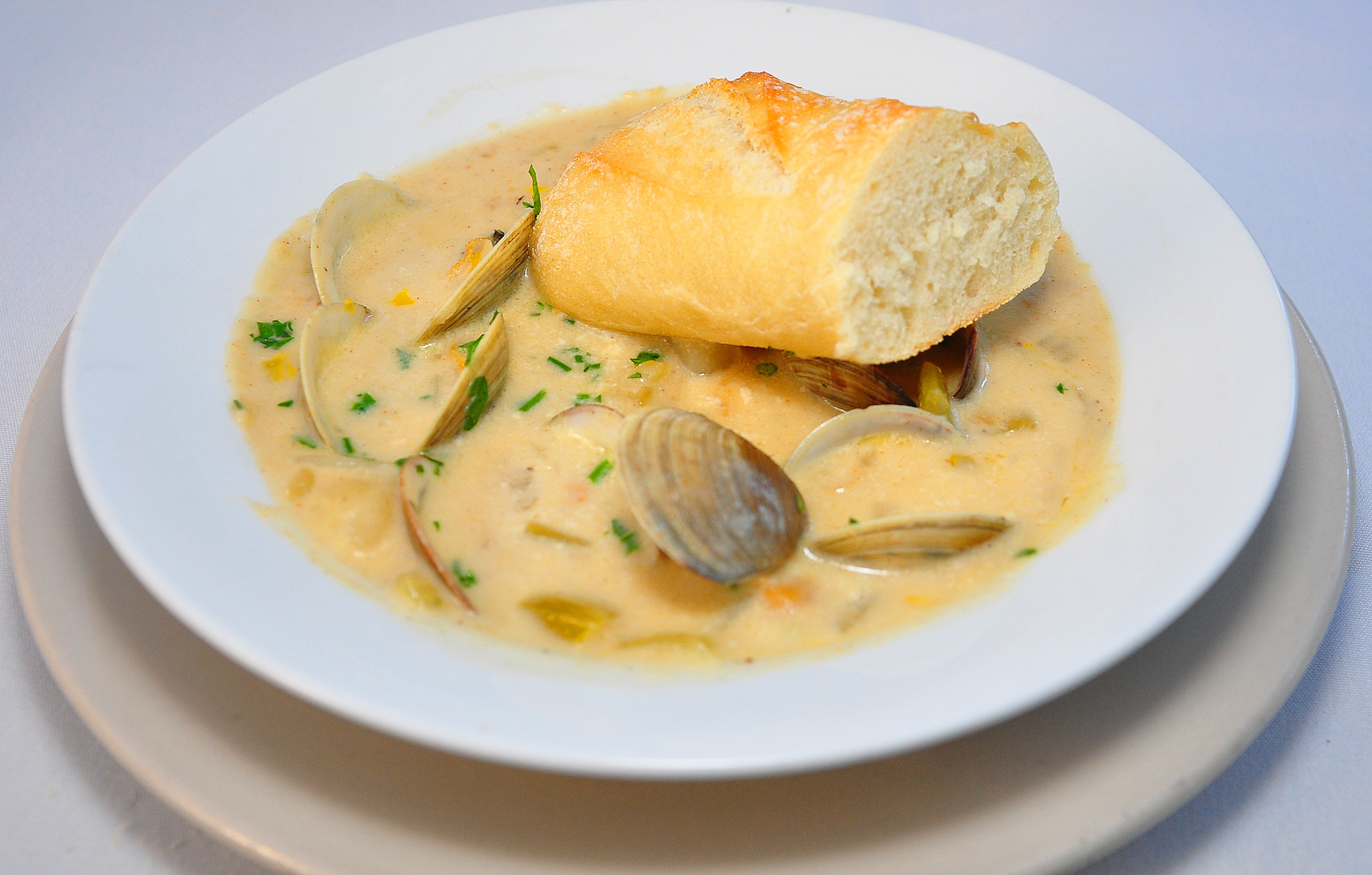 Small Plates menu includes Beau Soleil oysters and an absolutely amazing traditional Clam Chowder with shell-on steamed clams, smoked bacon and potatoes, onions and celery in creamy broth, topped with a chunk of freshly baked baguette.