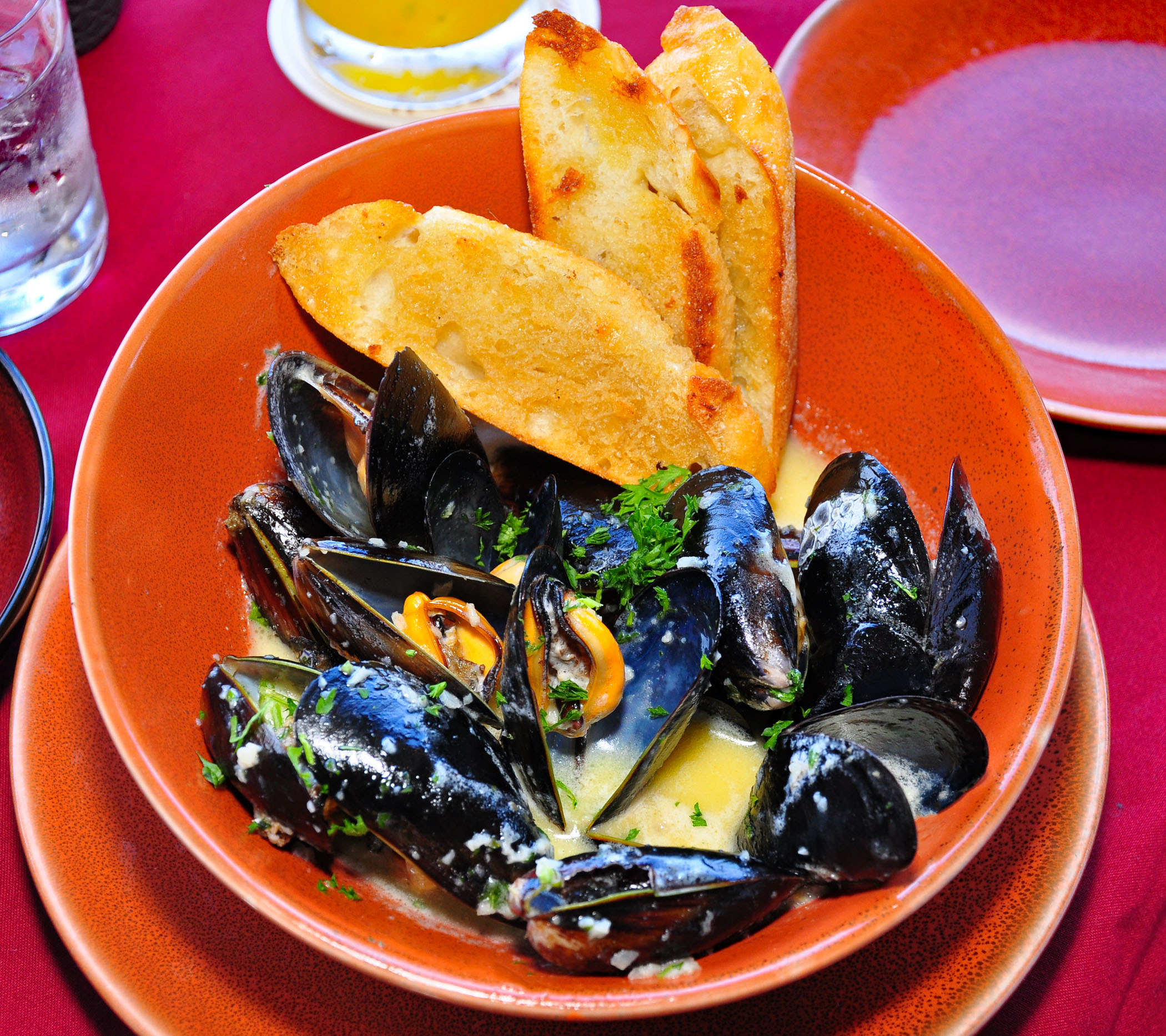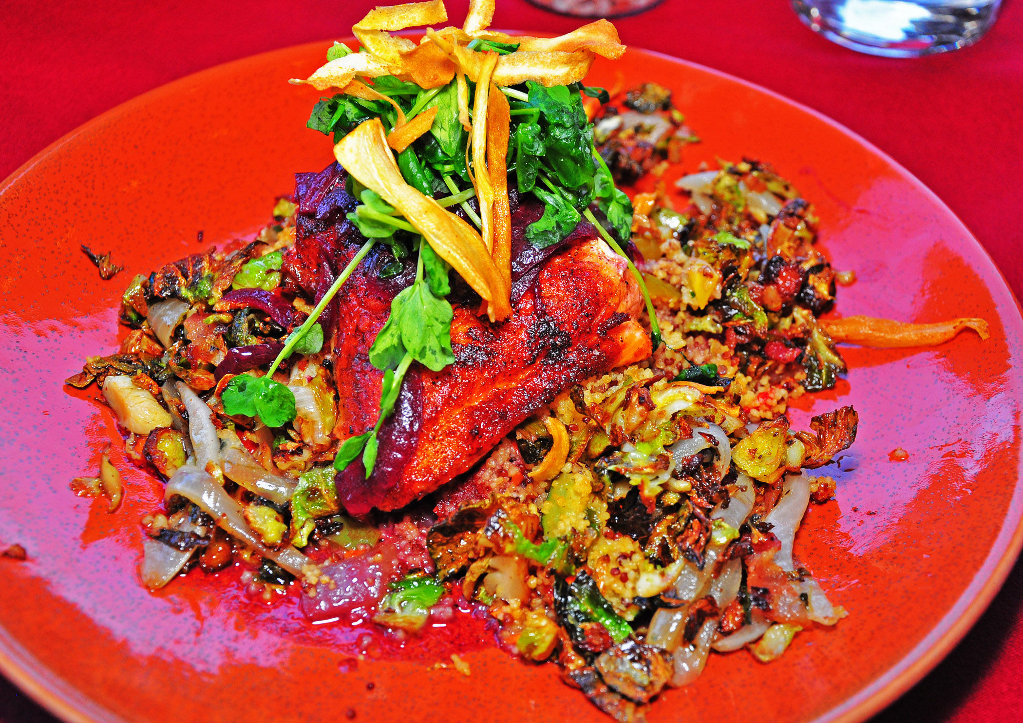 Of the many wonderful starters, pick the succulent Steamed “Penn Cove” Mussels with garlic, shallots, white wine, cream and toasted crostini, and on the Entrees menu—Pan Seared “Ora” King Salmon garnished with a complex and intriguing combination of spiced couscous and quinoa pilaf, sautéed Brussel sprouts, bacon, onion, and red onion beurre rouge.