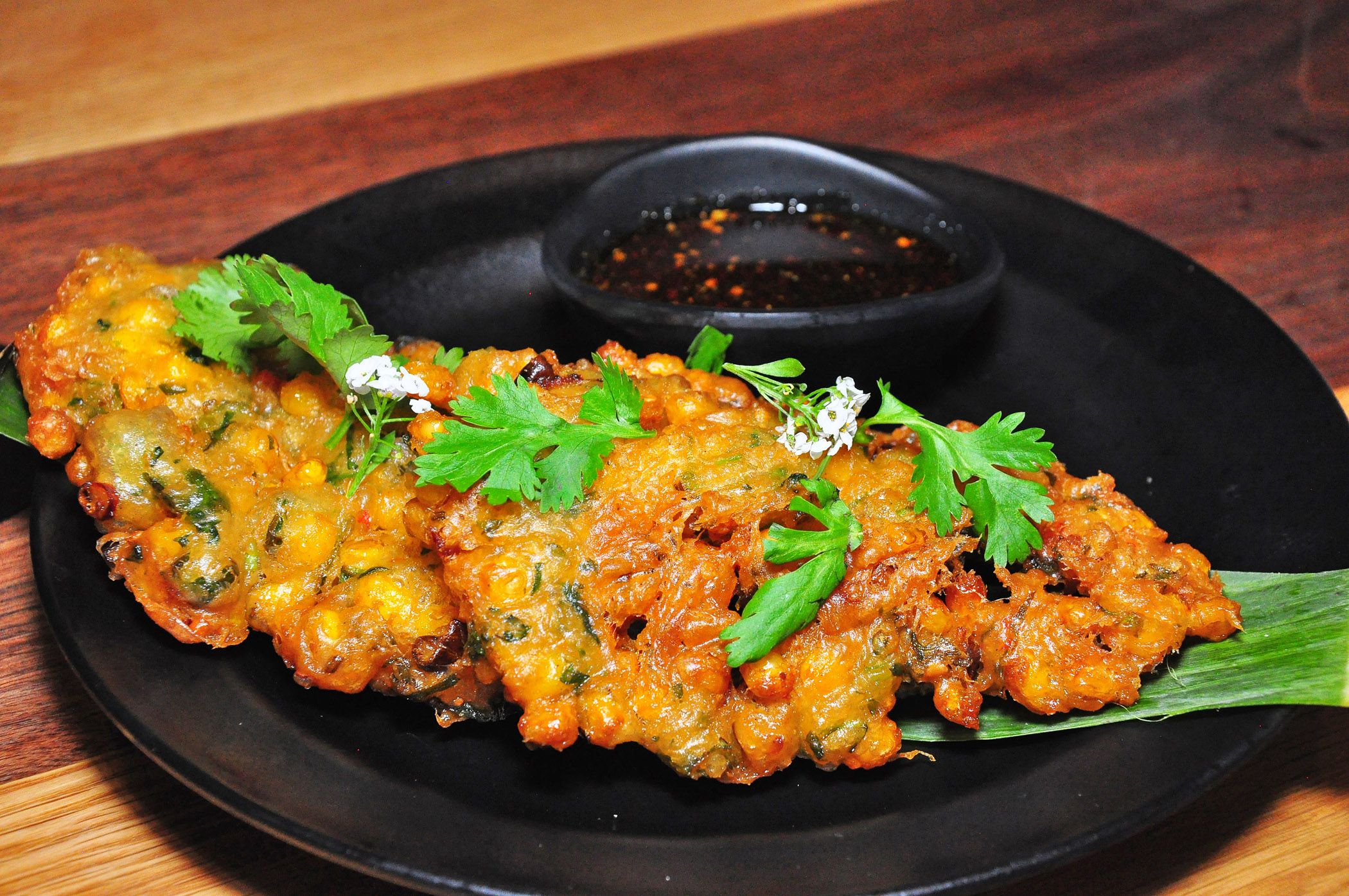 Every dish, made with fresh California produce and locally sourced meat and paultry, has a special ingredient or a few that tie it to the land of tropical fruit and spices. Small Plates menu features Bakwan—corn fritters made with okra, green onions, and markut lime leaves.