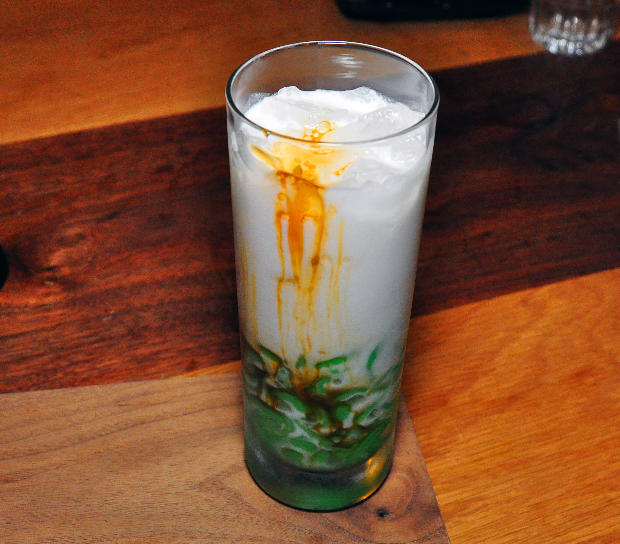 Desserts are not-to-be-missed—fruity, fragrant, and deeply satisfying. Es Cendol is made of bright green mung bean flour jelly, iced sweetened coconut milk, and pandan palm sugar. Coconut Lemongrass Panna Cotta is garnished with sesame coconut caramel sauce and candied orange.