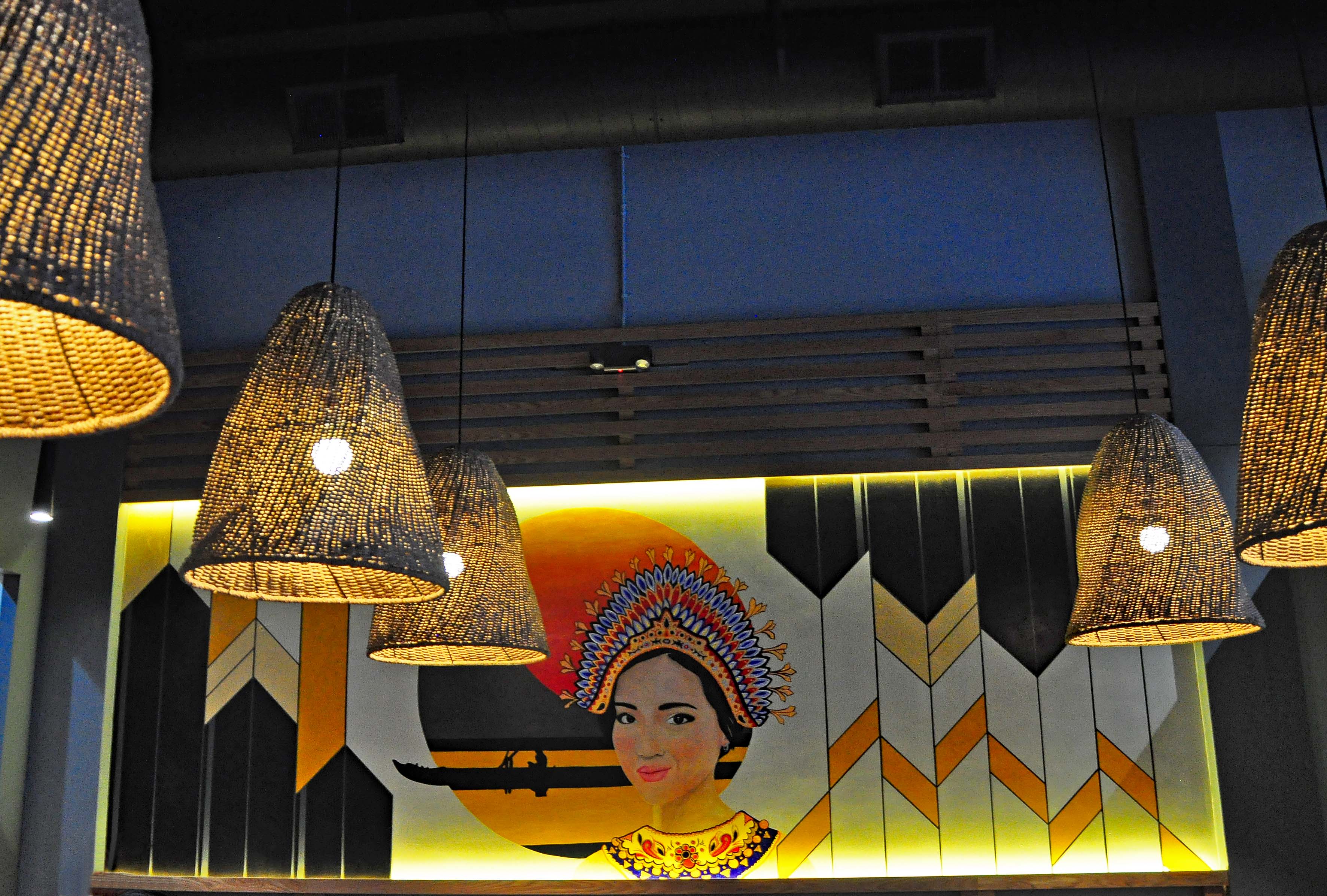 The dining room design, created by Anastasia Contakos, showcases a large mural with Southeast Asian motif, wicker lamp shades, and art deco elements above the comfy tables and chairs.