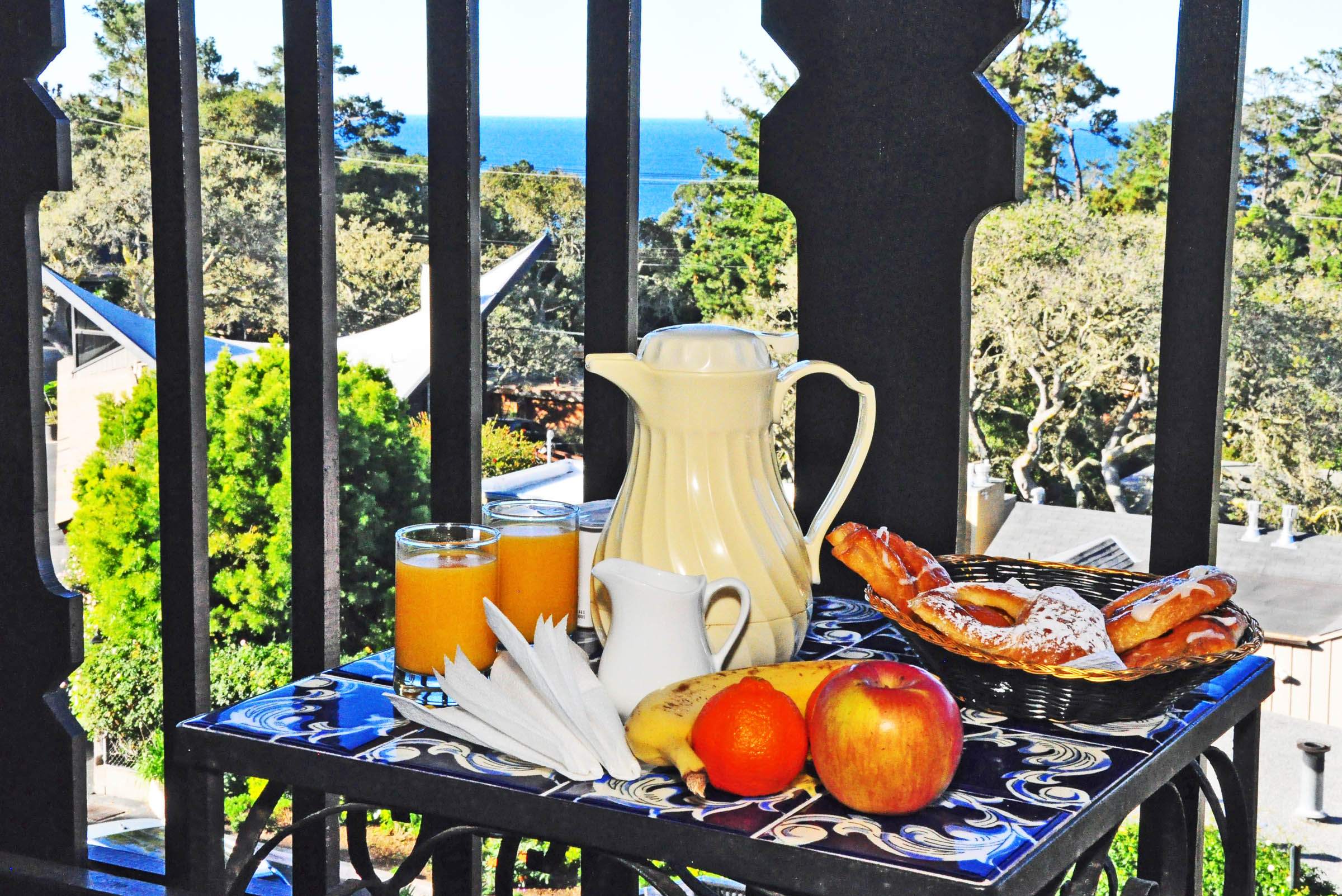 At the front desk office, with its copper fireplace and a cozy living room feel, a continental breakfast is served every morning. Many hotel guests prefer to take it to their own balconies, or to a wrap-around terrace with tables and chairs, and the always enticing ocean views.
