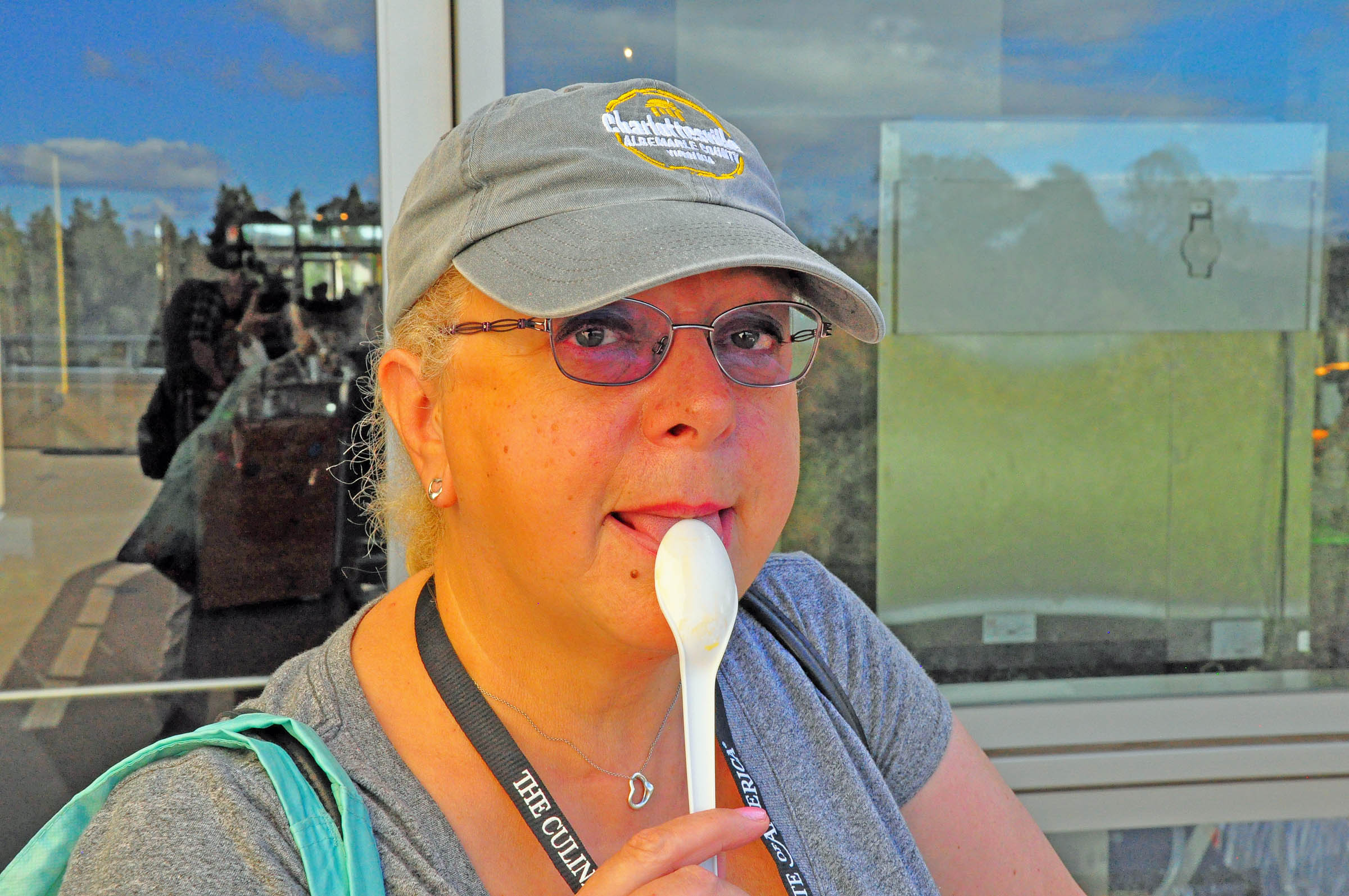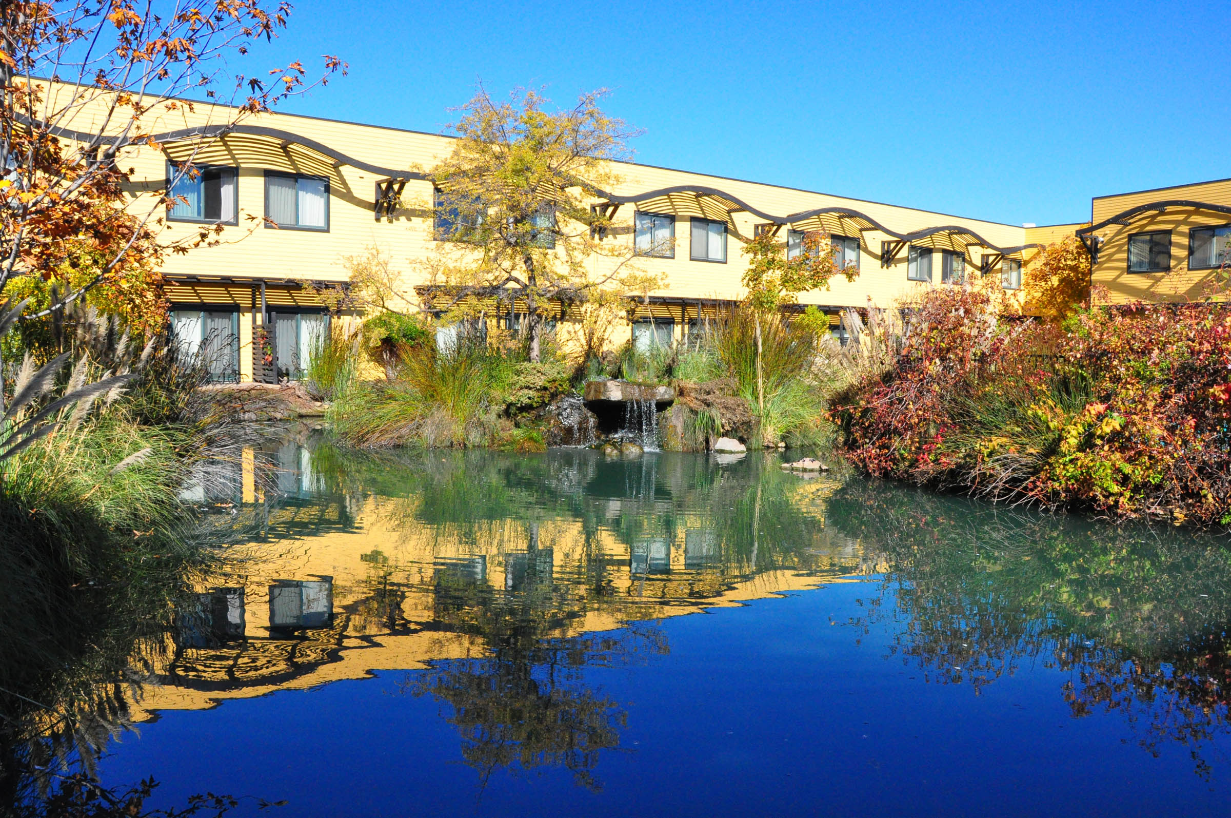 What came to the rescue? The DoubleTree by Hilton Hotel & Spa Napa Valley – American Canyon. About 20 minutes’ drive from Napa, the hotel is large, clean, and nicely decorated, with a spacious lobby behind a fountain, surrounded with flowers and fruit trees, like kumquat and feijoa. From my comfortable room with opening widows I could see a gorgeous reed-lined lagoon with some resident ducks, and marvel at the beautiful landscaping. There was a tempting-looking spa, which I couldn’t visit due to time constraints, and a cozy swimming pool with a hot tub, which I gladly indulged in before and after the conference happenings.