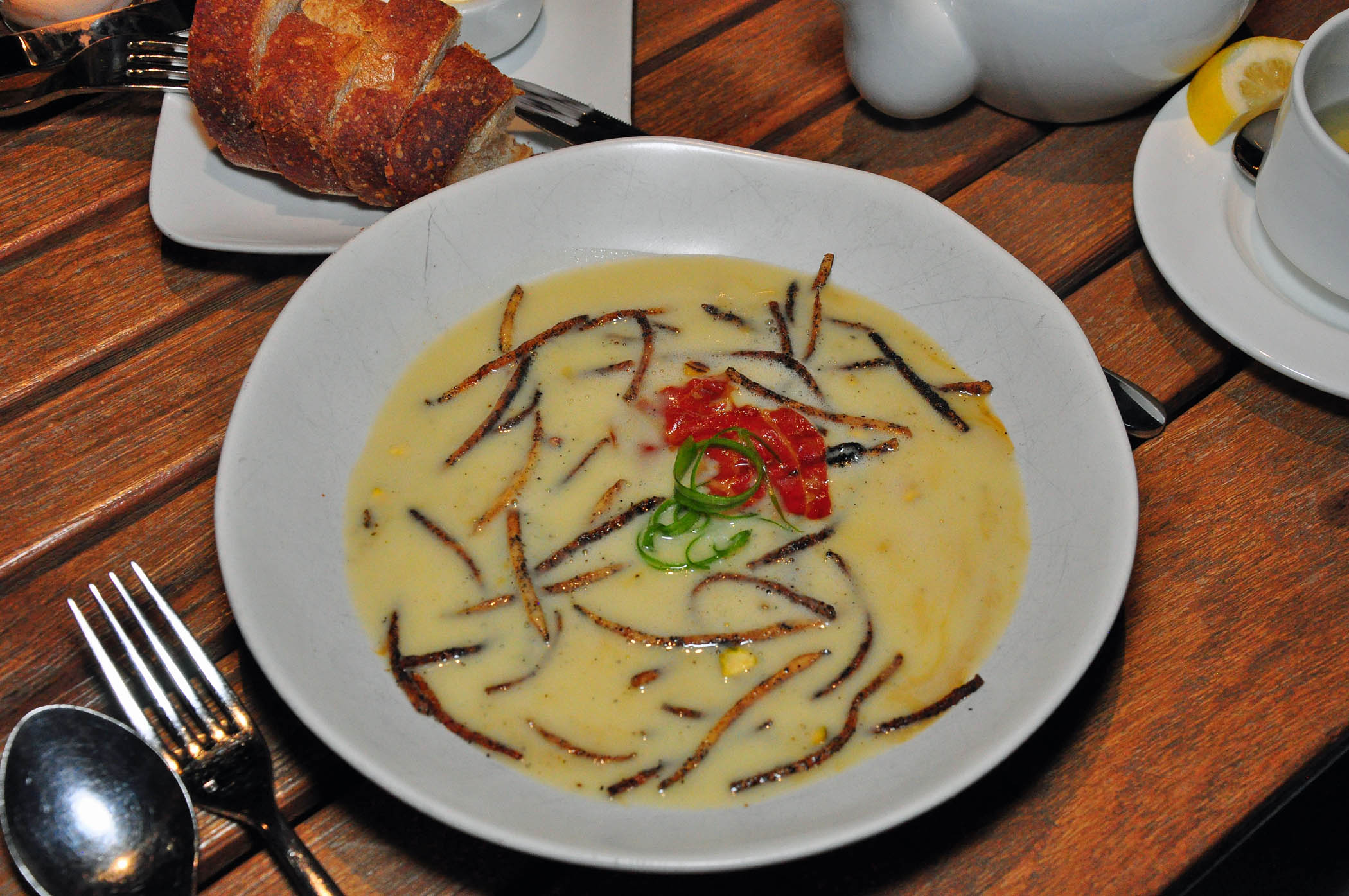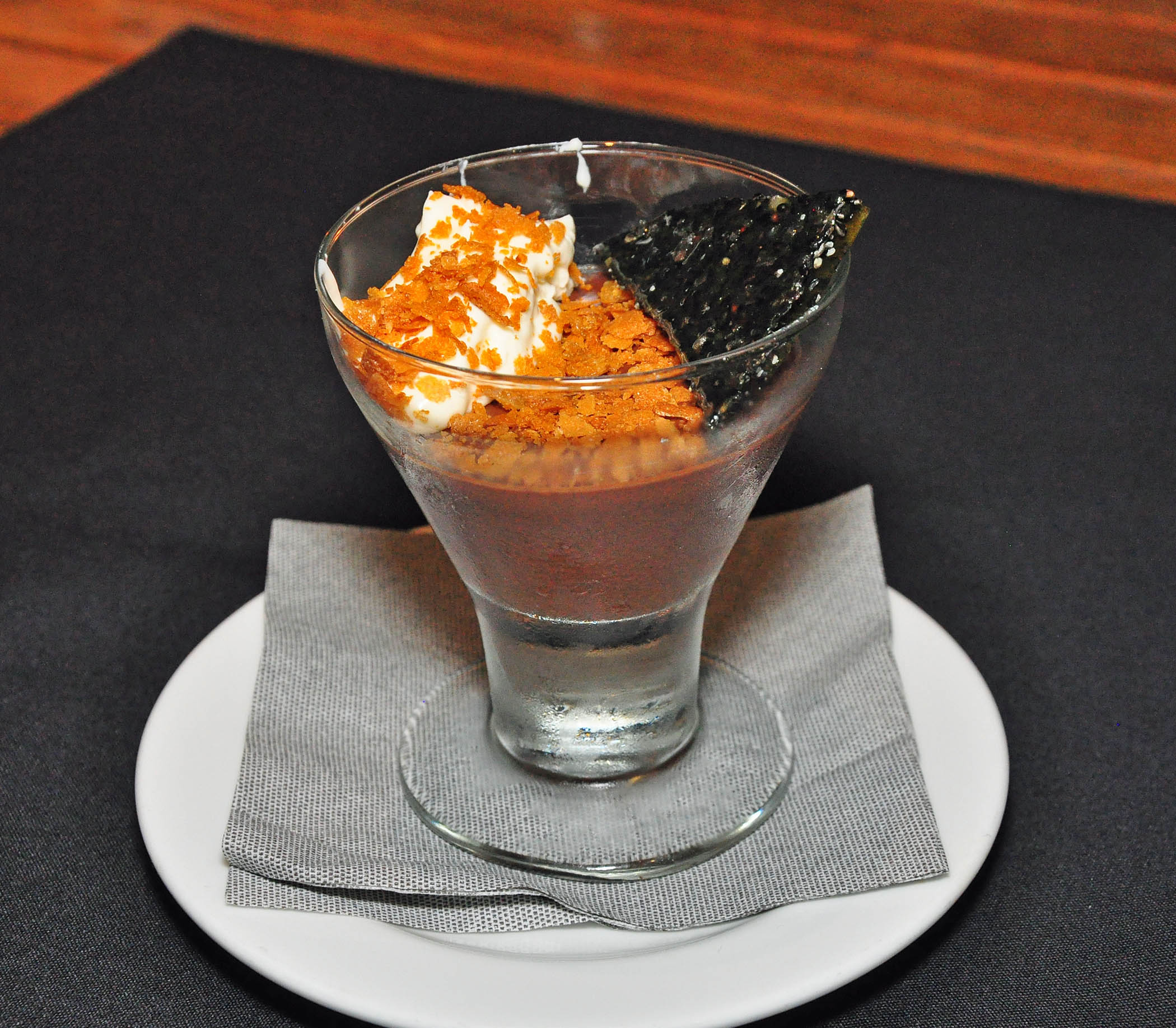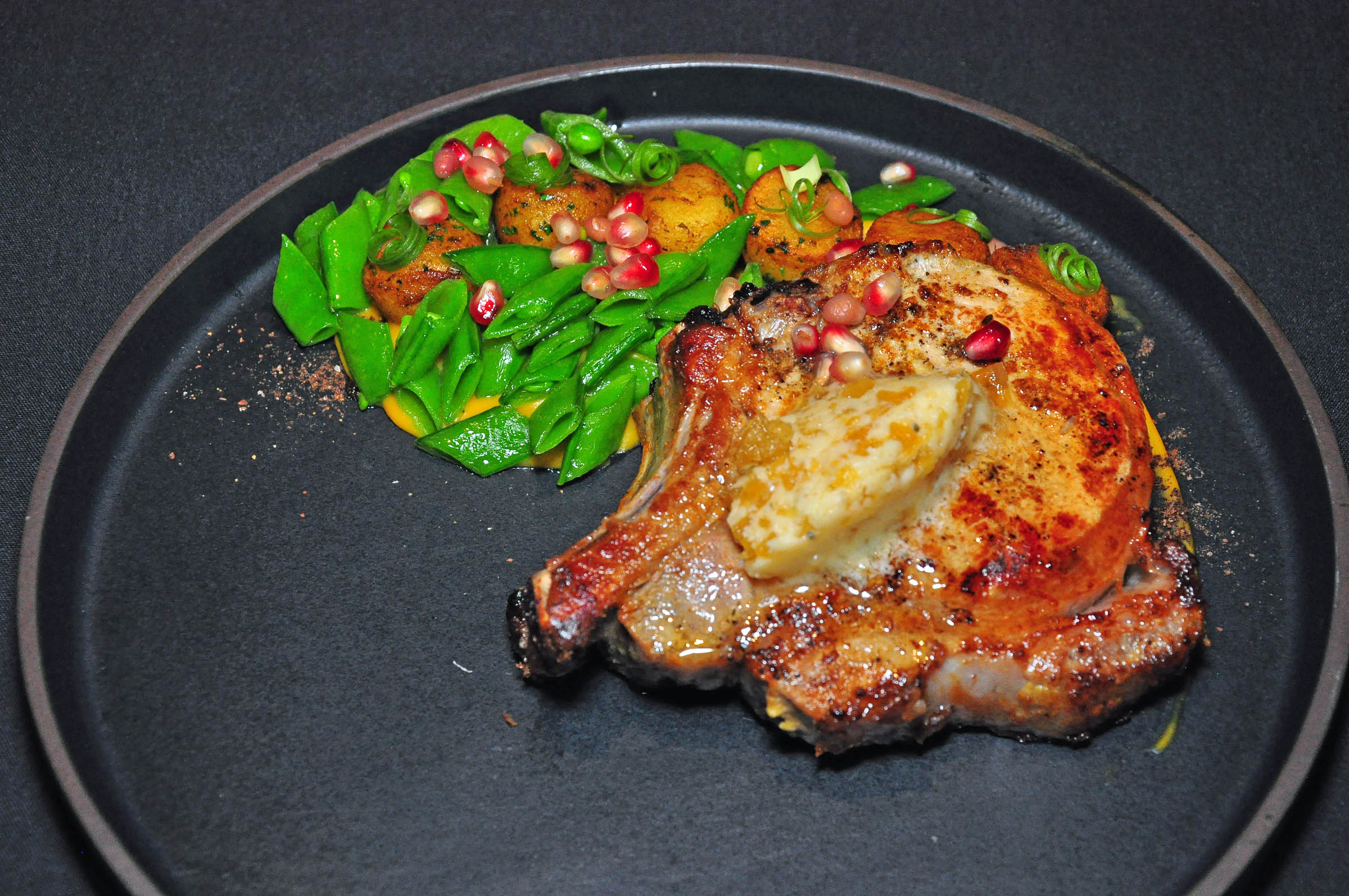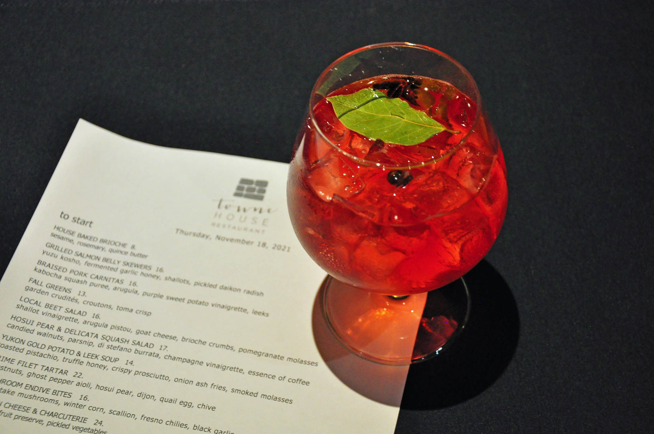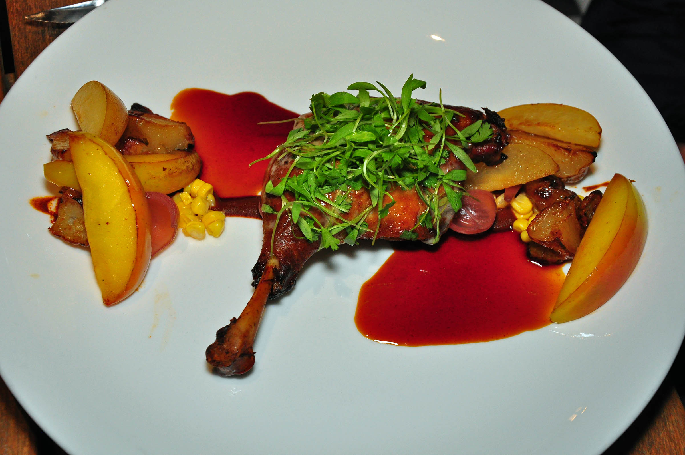 Many creatively used fresh ingredients make appearances in craft cocktails, like Golden Bear Old Fashioned made with local peach and fig infused bourbon, and beautifully plated dishes, like a vegetable soup of the day, Carlton Farm pork chop with duck fat poached potatoes, snap peas, apple butter, butternut gastrique puree, and pomegranate kernels, or roasted Petaluma duck leg with crispy sunchokes, seared Fuji apples, Cru chocolate mole, Bartlett pears, and pickled corn.