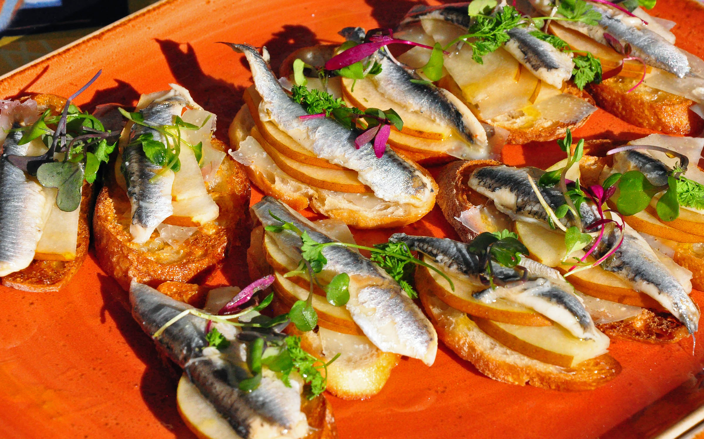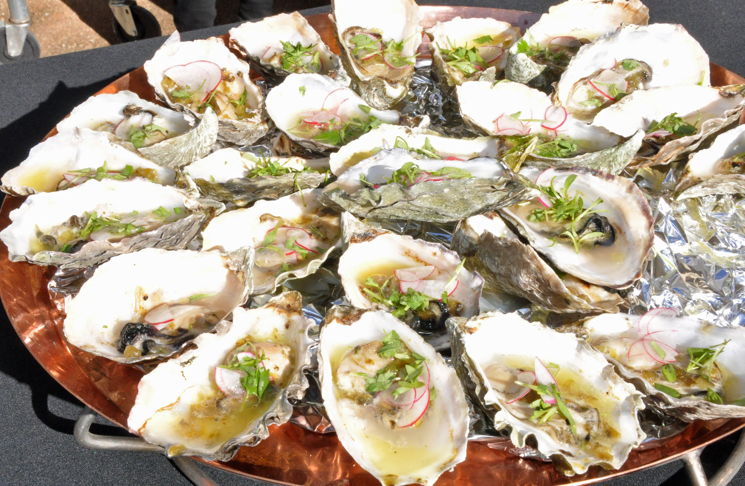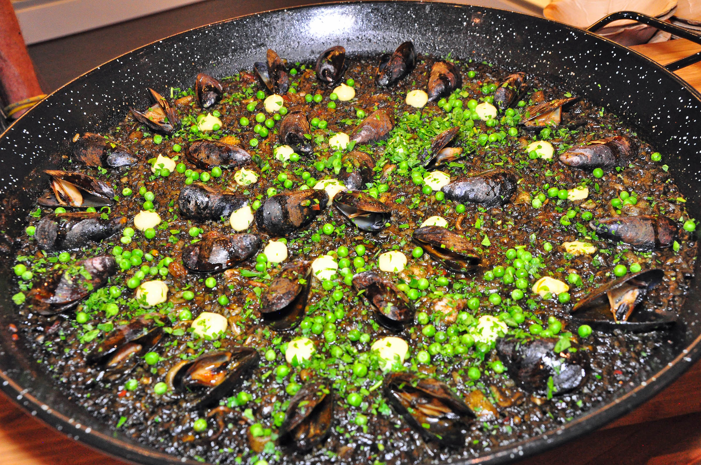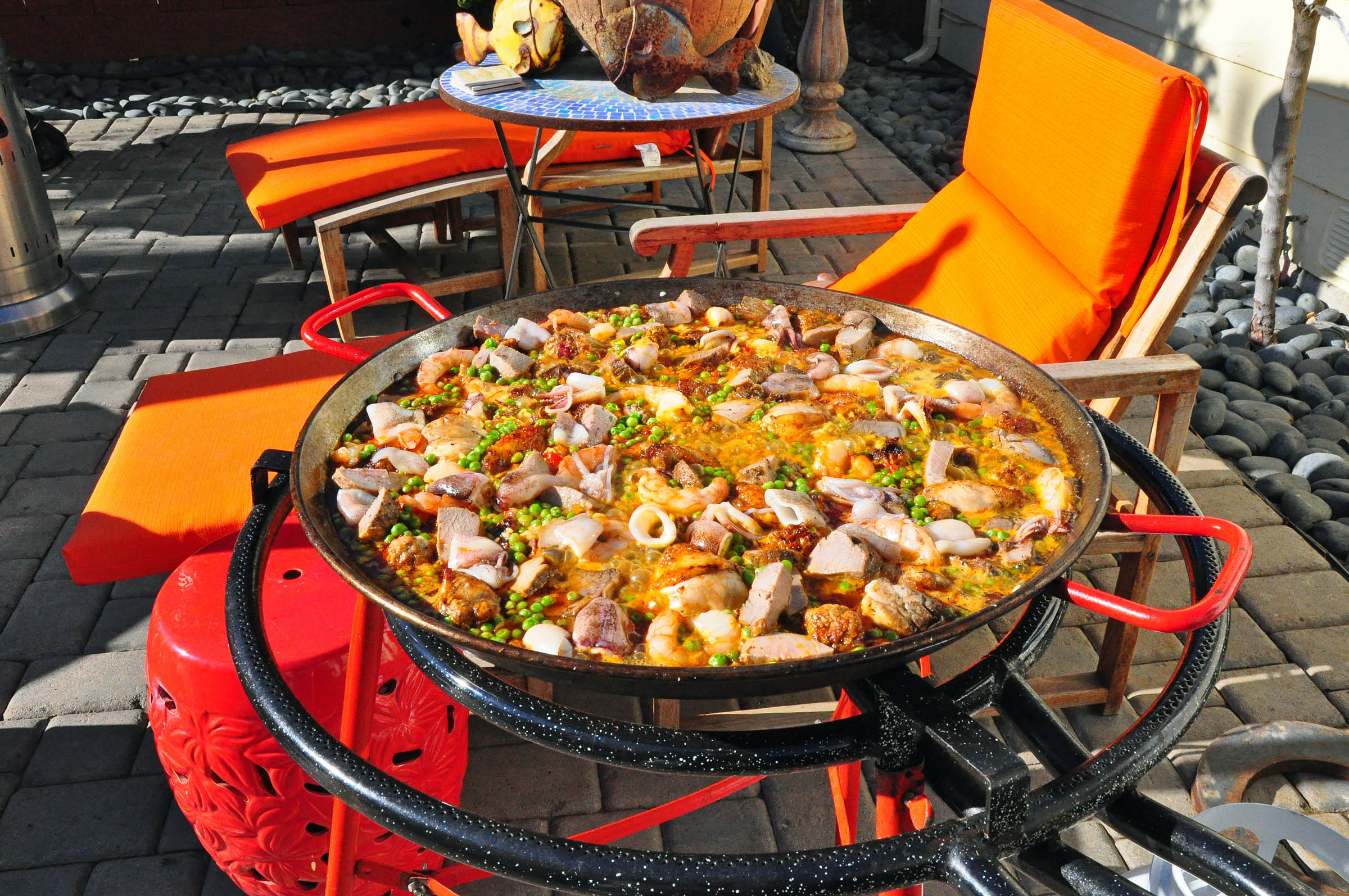 Since the authentic Spanish paella must be prepared for a crowd, in a giant pan, and outdoors, I welcomed a chance to watch Chef Miller masterfully perform a kind of a dinner-and-a-show gig in his own backyard, where he was doing his magic over a light-weight mobile stove. The sizzling seafood, chicken, short rib, green peas, and saffron rice emitted heavenly aromas, and looked pretty tempting to me as a colorful medley of golden brown meats and orange shrimp, plus tiny baby squid tentacles and bell pepper specks of red adding to the appetizing mosaic. The Chef explained that the paella is only ready when the rice reaches its desired crispiness, achieved moments before the entire thing might burn out in less experienced hands.