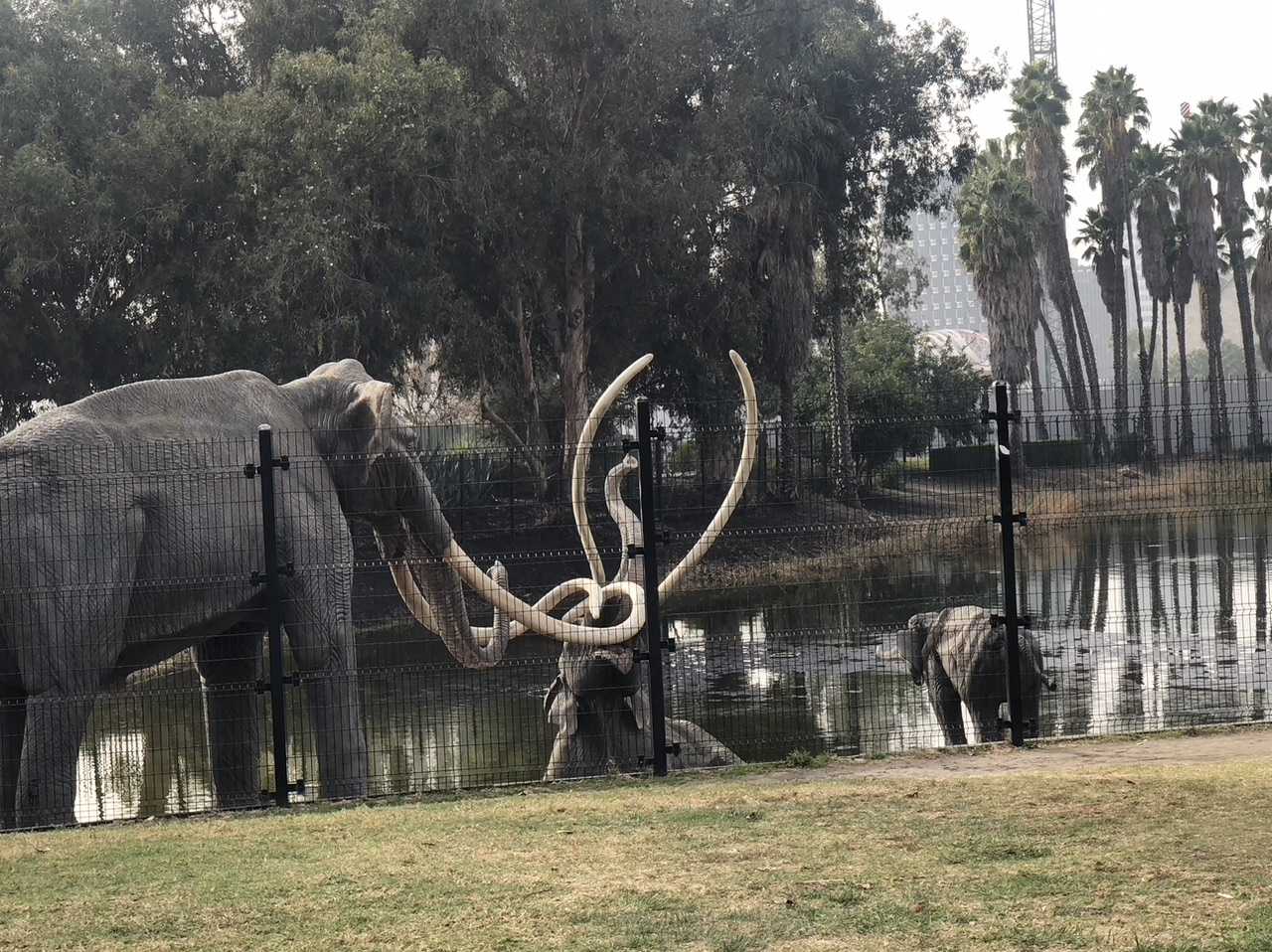 In ancient times this was a large lake. Many species of indigenous animals came to drink, unaware that the ground below the water was dangerous. Their hoofs and feet sank into the soft muck and became irretrievably stuck! Unable to move from the goo, many animals became trapped and died. In this vast and lovely Park, a statue of a huge elephant first attracted our attention and there we found a small lake behind a fence. The sign indicted it was the first of these tar pits in which a fossil was discovered. It was confirmed as a saber-toothed cat. By early 1900’s fossil digging began in earnest.